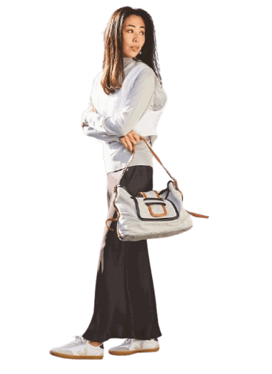 フェミニンなナロースカートに、ローテクスニーカーを合わせれば、甘さを程よく崩した大人のこなれバランスが即完成。軽量でしなやかな素材のため、歩きやすく休日にもぴったりです。ぺたんこならではの抜け感が、春のスタイルをいっそう洒落た大人のムードへと導いてくれます。