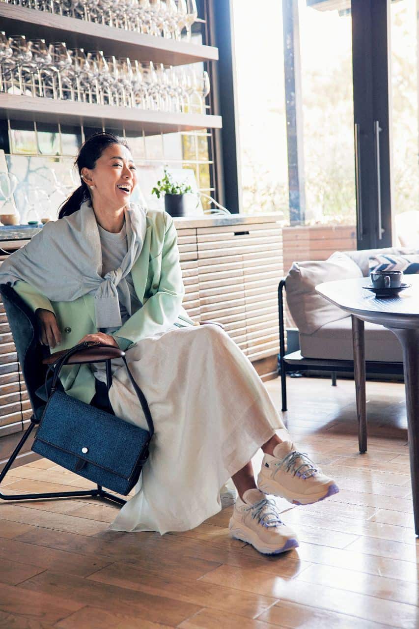 スニーカー¥38,500(ホカ®/デッカーズジャパン)ジャケット¥70,400(ルームエイト ブラック/オットデザイン)ニット¥39,600カーディガン¥42,900スカート¥59,400(すべてエイトン/エイトン青山)バッグ¥63,800(ア ヴァケーション/ノーベルバ)イヤーカフ¥20,900(マッソーズアンドマッソーズ/ショールーム ロイト)ピアス¥27,500(マユ/マユ ショールーム)