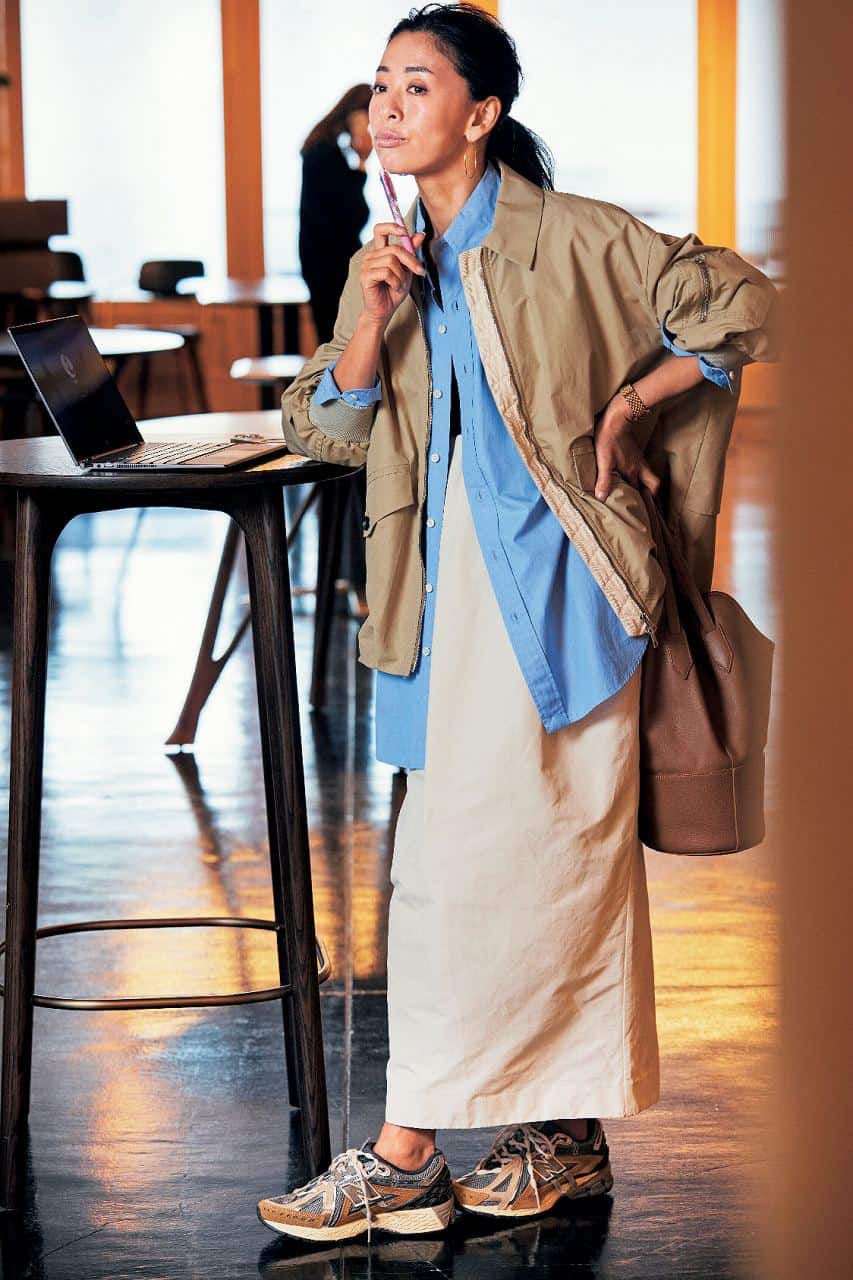 柔らかな抜け感コーデに、ゴールドラインが効いたハイテクNBが絶妙なアクセント。足元をスポーティに振ることで、こなれた抜け感が生まれます。40代が取り入れやすい落ち着いた配色が品よく輝き、シンプルなのに洗練された印象に。