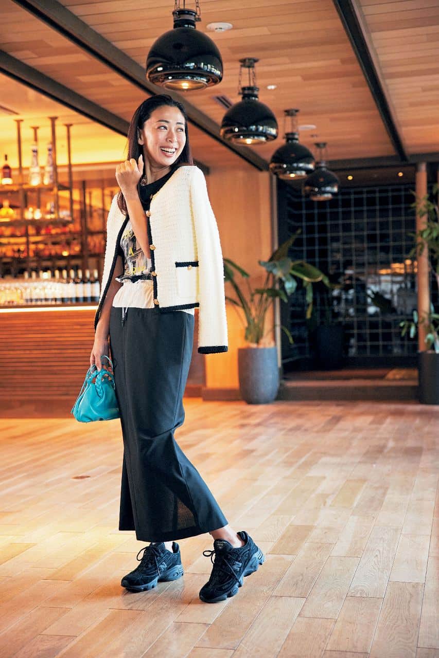 エレガントなカーデにあえてゴツめのハイテクを合わせることで、気張りすぎない大人の余裕が生まれます。足元にボリュームがあるため、タイトスカートでメリハリを作ると即・今っぽいバランスに。40代でも取り入れやすい上品ハイテクの代表格です。