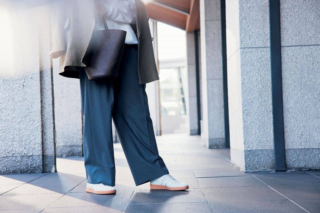 淡色スニーカーで働く40代の足元をスマートに