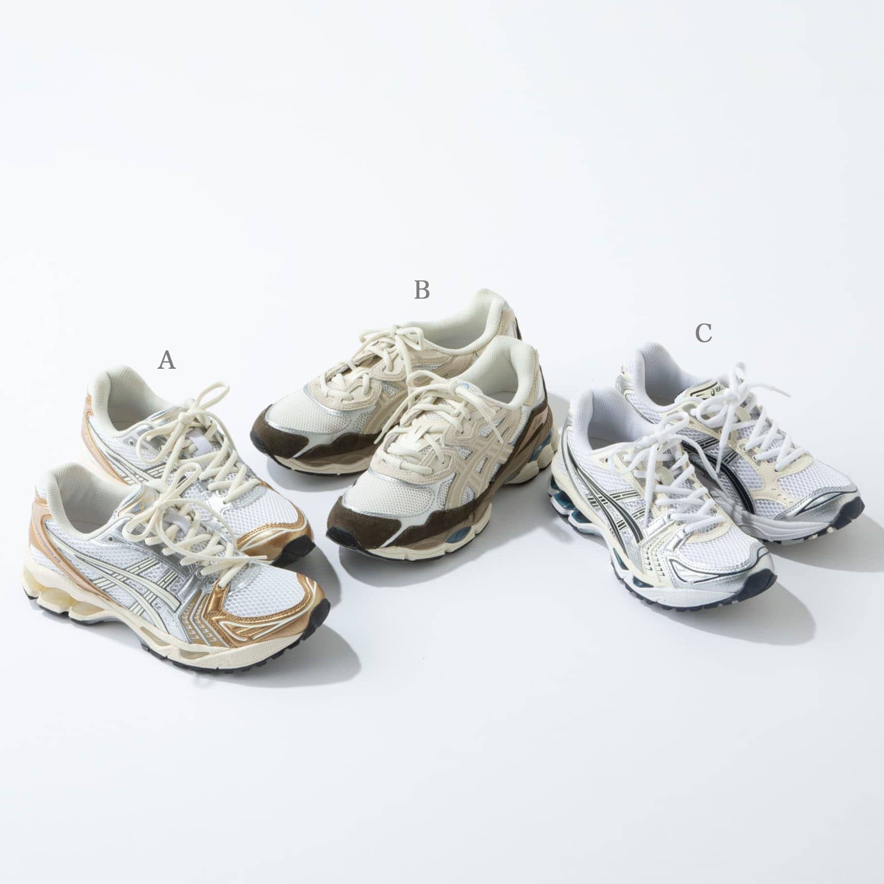 A:白×ゴールドの配色が柔らかい印象の一足。足元に少し印象をつけたい時にも◎
