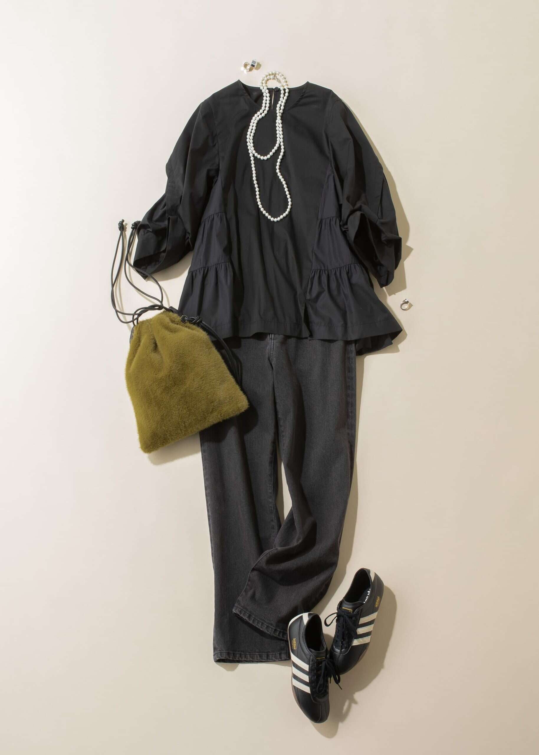 甘めデザインの黒ブラウスを、白ラインが効いた黒スニーカーでほどよく引き締めたワントーン。薄底のすっきりラインが大人の上品さを保ちつつ、アディダスのスポーティさで抜け感がプラス。親しみやすく、でもちゃんと今っぽいシンプル黒コーデの最適解です。