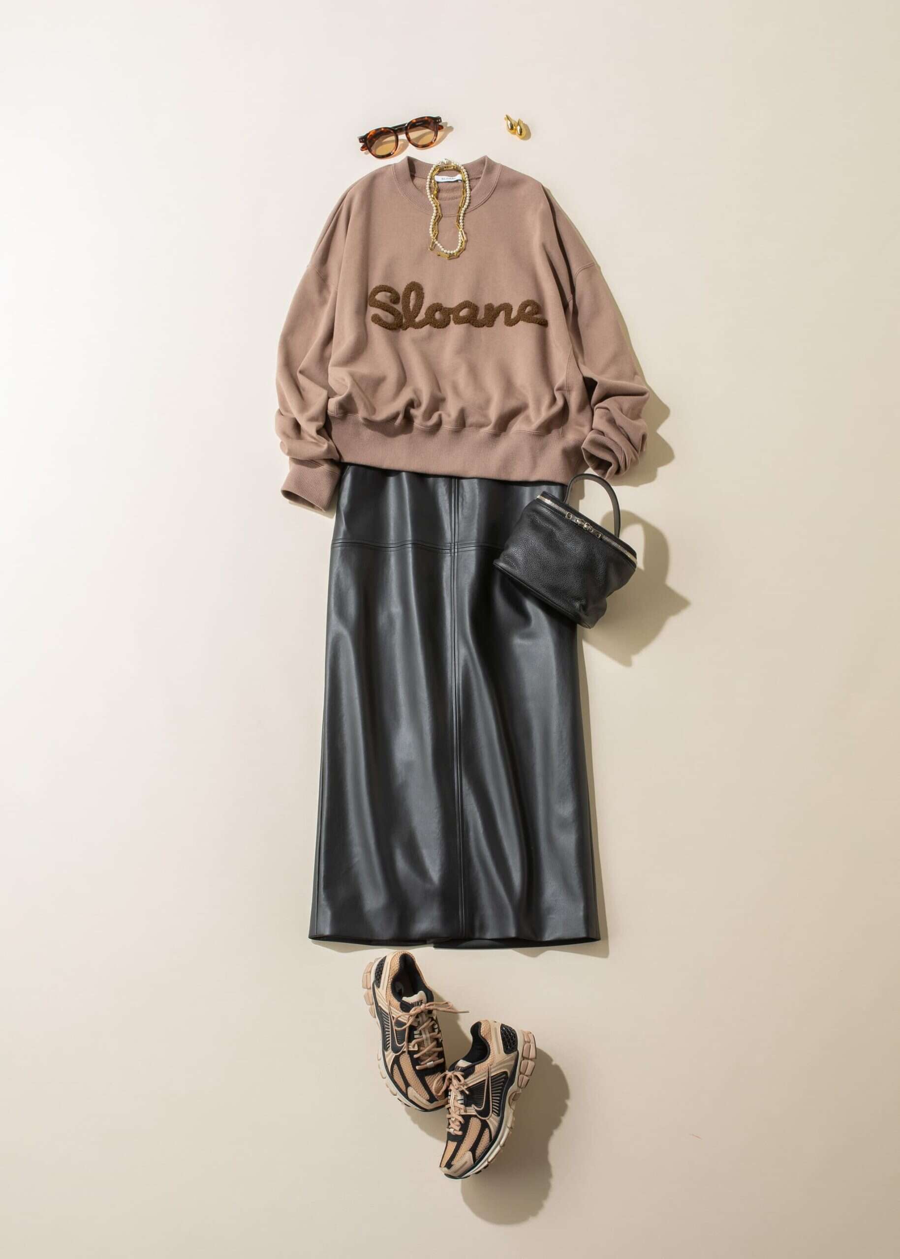 スニーカー[NIKE ZOOM VOMERO 5(ボメロ)]¥22,330(ナイキ/NIKE カスタマーサービス)スウェット¥18,700(スローン/ザ ショップ スローン 新静岡セノバ店)スカート¥22,000(ELENDEEK)バッグ¥47,300(バケッド バゲージ/アイネックス)サングラス¥1,990(UNIQLO)イヤリング¥7,700パールネックレス¥6,930(ともにアビステ)YGネックレス¥9,900(ワンエーアールバイウノアエレ/ウノアエレ ジャパン)(すべてウノアエレ ジャパン)