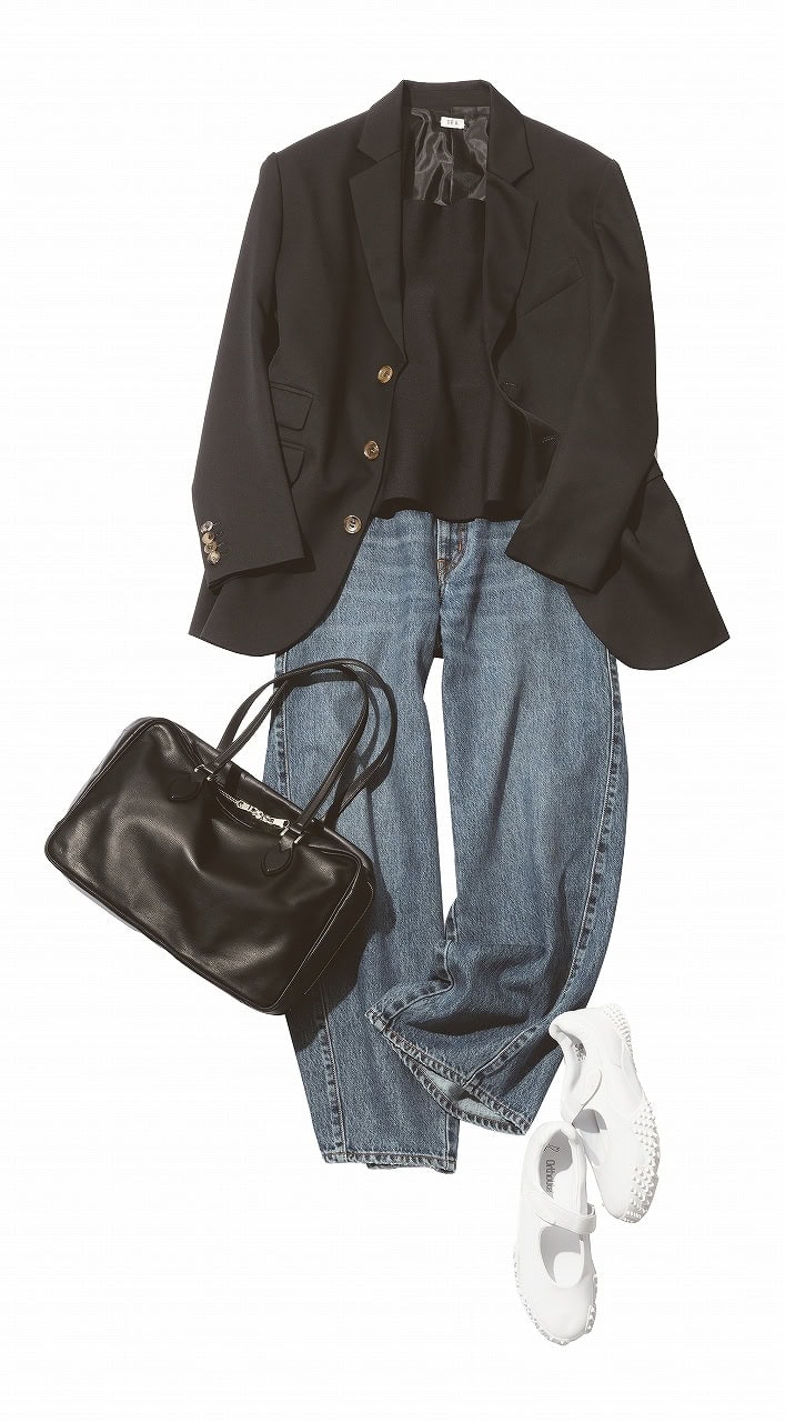 定番の黒ジャケット×デニムに、今季トレンド大本命のバレエスニーカーで可愛げをひとさじ。クリーンな白が足元を軽く見せ、ジャケットの堅さもやわらげて、上品さをキープしたまま全身を一気に明るく見せてくれます。