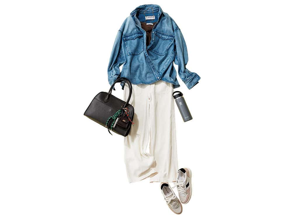 デニムシャツと白パンツの爽やかコーデに、スニーカーがほんのり可愛げをプラス。淡色の柔らかさと黒の締め色が絶妙で、足元だけでコーデの完成度がぐっと上がります。40代でも甘さが浮かず、品よくまとまる配色バランスがポイント。