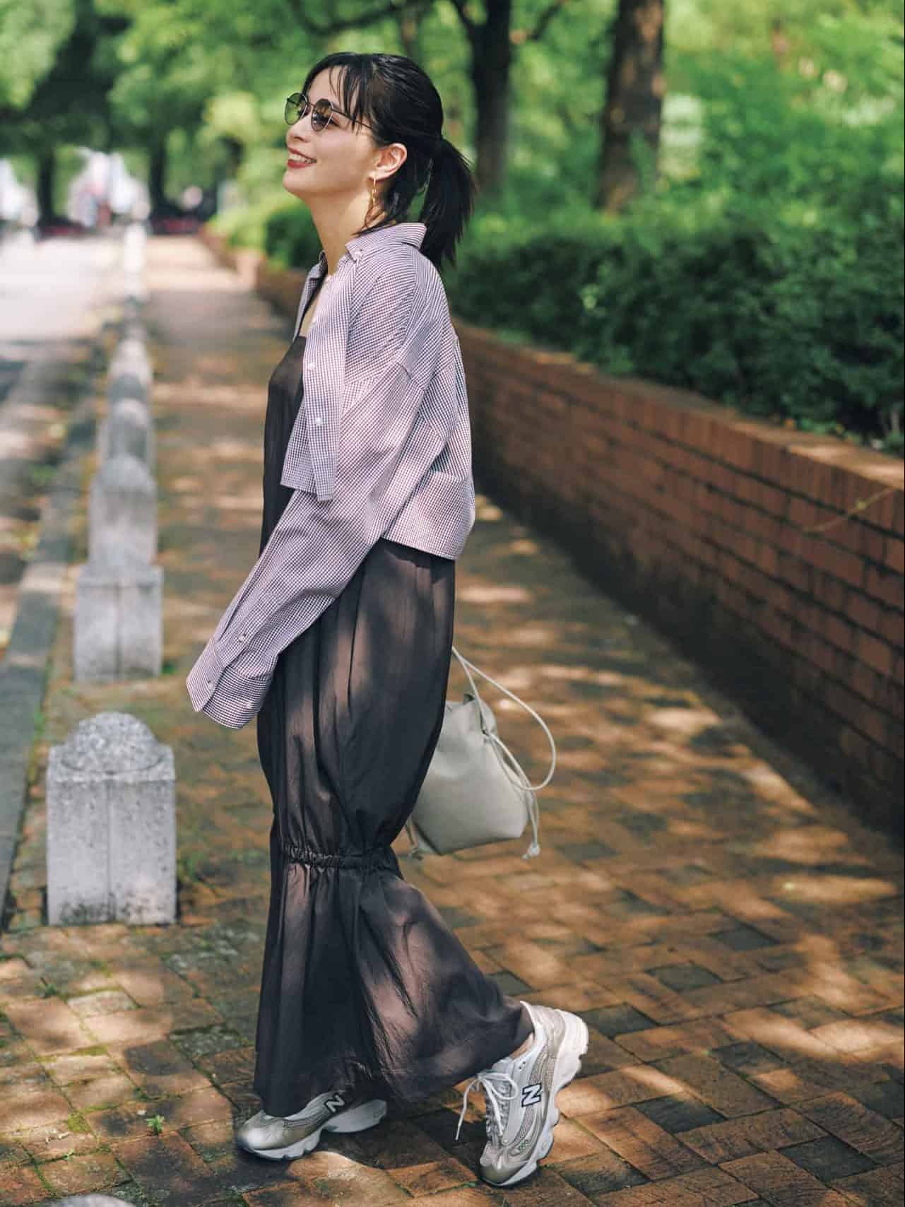 スニーカー¥19,800(ニューバランス/ニューバランスジャパンお客様相談室)ワンピース¥34,000(シーニュ)シャツ¥9,460(ミラ オーウェン/ミラ オーウェン ルミネ新宿2店)バッグ¥45,100(ヴァジック/ヴァジックジャパン)ピアス¥34,100(シャルロット ウーニング/フラッパーズ)サングラス/スタイリスト私物
