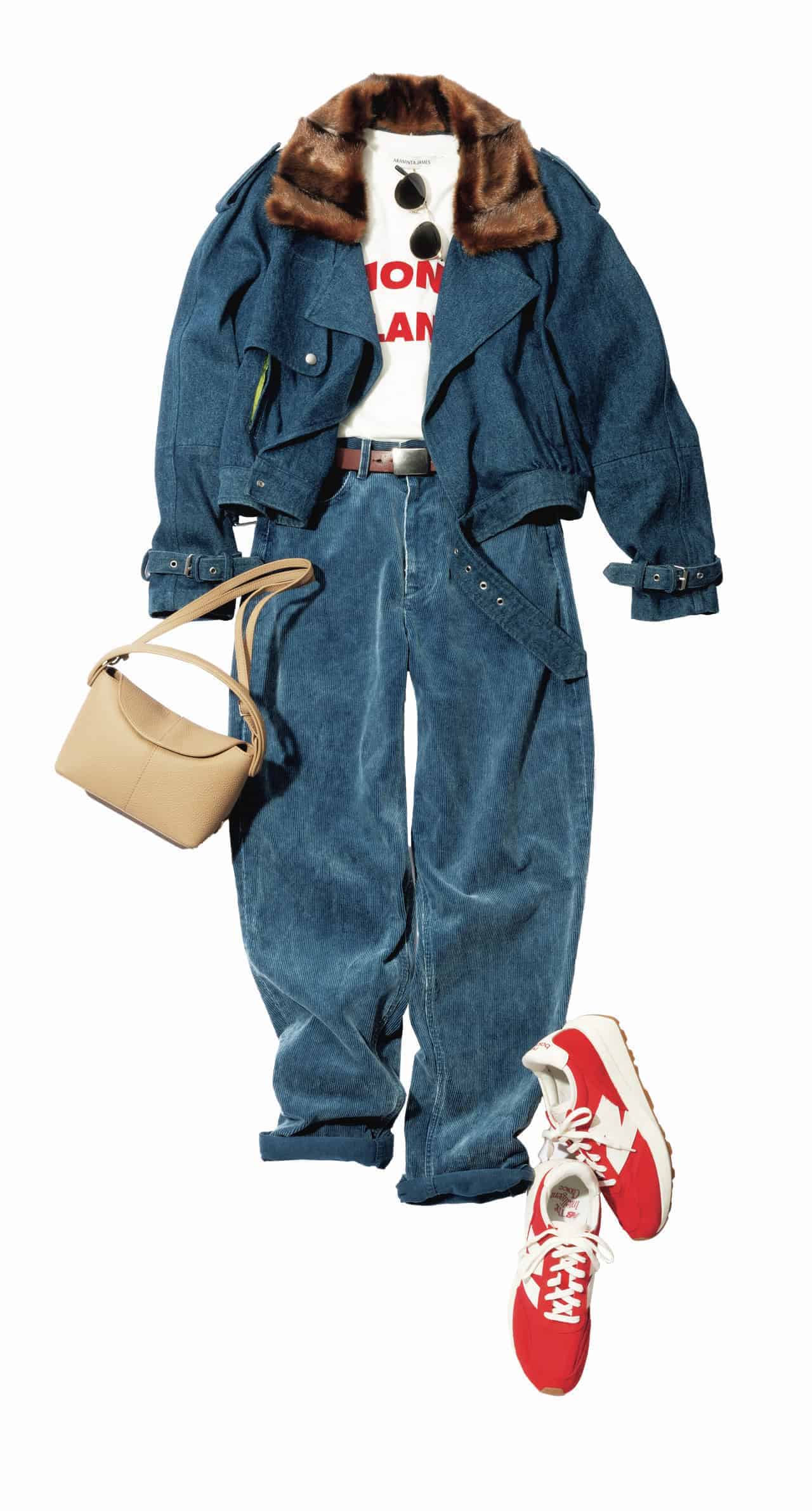 スニーカー¥16,500(アスファルト/フォーティーン ショールーム)コート¥154,000(ハイク/ボウルズ)デニムジャケット¥20,900(アルページュストーリー)カットソー¥17,600(サードマガジン)パンツ¥49,500(ギャルリー・ヴィー/ギャルリー・ヴィー丸の内店)バッグ¥36,300(ヴィアメイルバッグ/ティースクエア プレスルーム)ピアス¥10,450(ココシュニック オンキッチュ/ココシュニック)ネックレス¥12,100(Pearl for Life{hlb}/ロードス)ソックス¥1,375(靴下屋/タビオ)