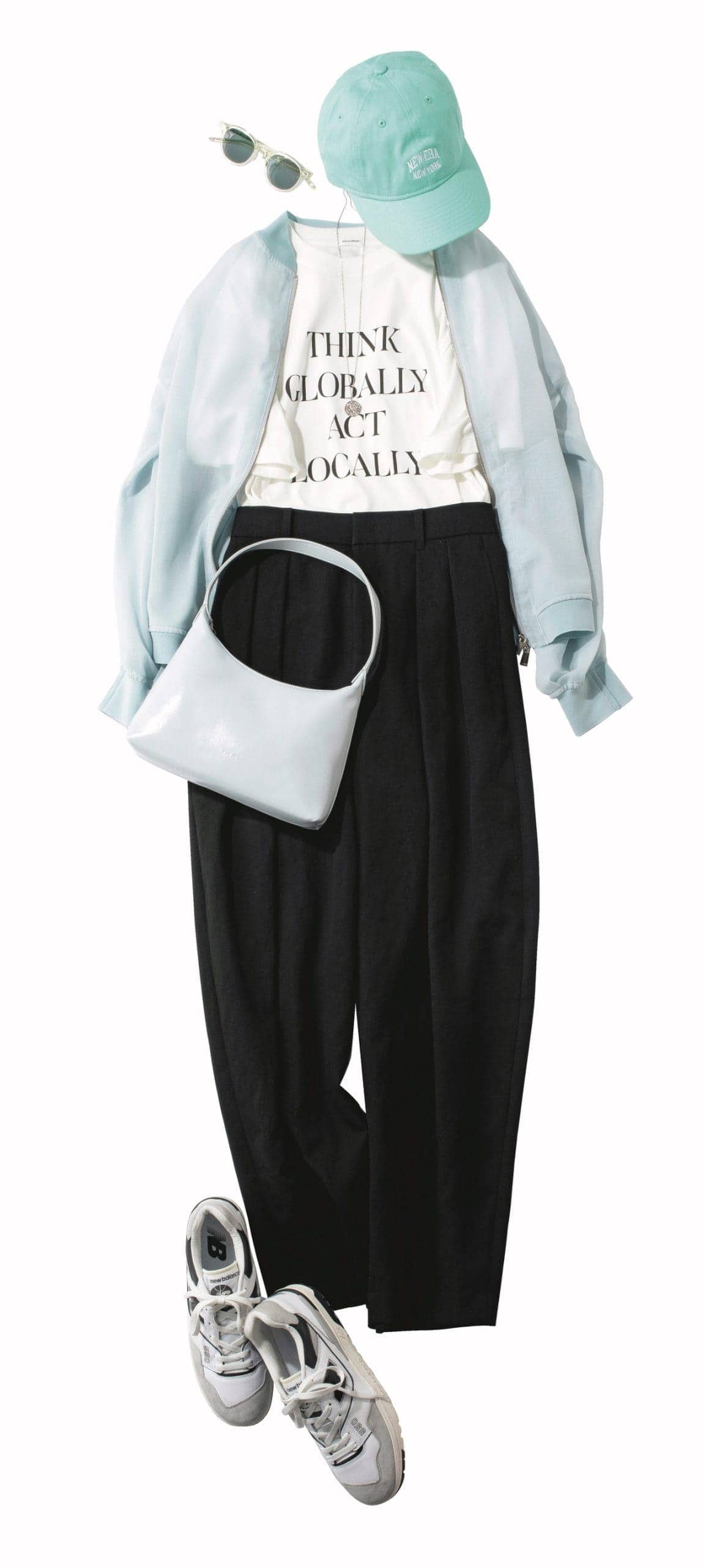 スニーカー¥19,800(ニューバランス/ニューバランスジャパンお客様相談室)パンツ¥25,300(カレンソロジー/カレンソロジー二子玉川)ブルゾン¥66,000(タトラス/タトラス 日本橋店)Tシャツ¥4,500Mila OwenMila Owen ルミネ新宿2店)バッグ¥13,970(スタンドオイル/ル タロン 有楽町マルイ店)キャップ¥4,620(ニューエラ)サングラス¥101,20010 アイヴァン/アイヴァン PR)ネックレス¥30,800(マリハ)