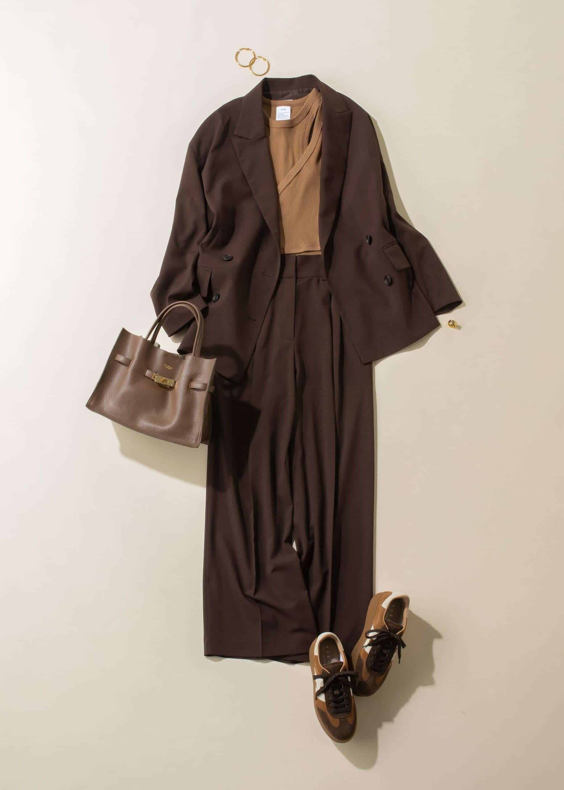 ブラウンのセットアップに同系色のスエードスニーカーを合わせた、秋らしいワントーンコーデ。スエードの質感が上品で、セットアップでも堅く見えず、今っぽいリラクシーさが漂います。