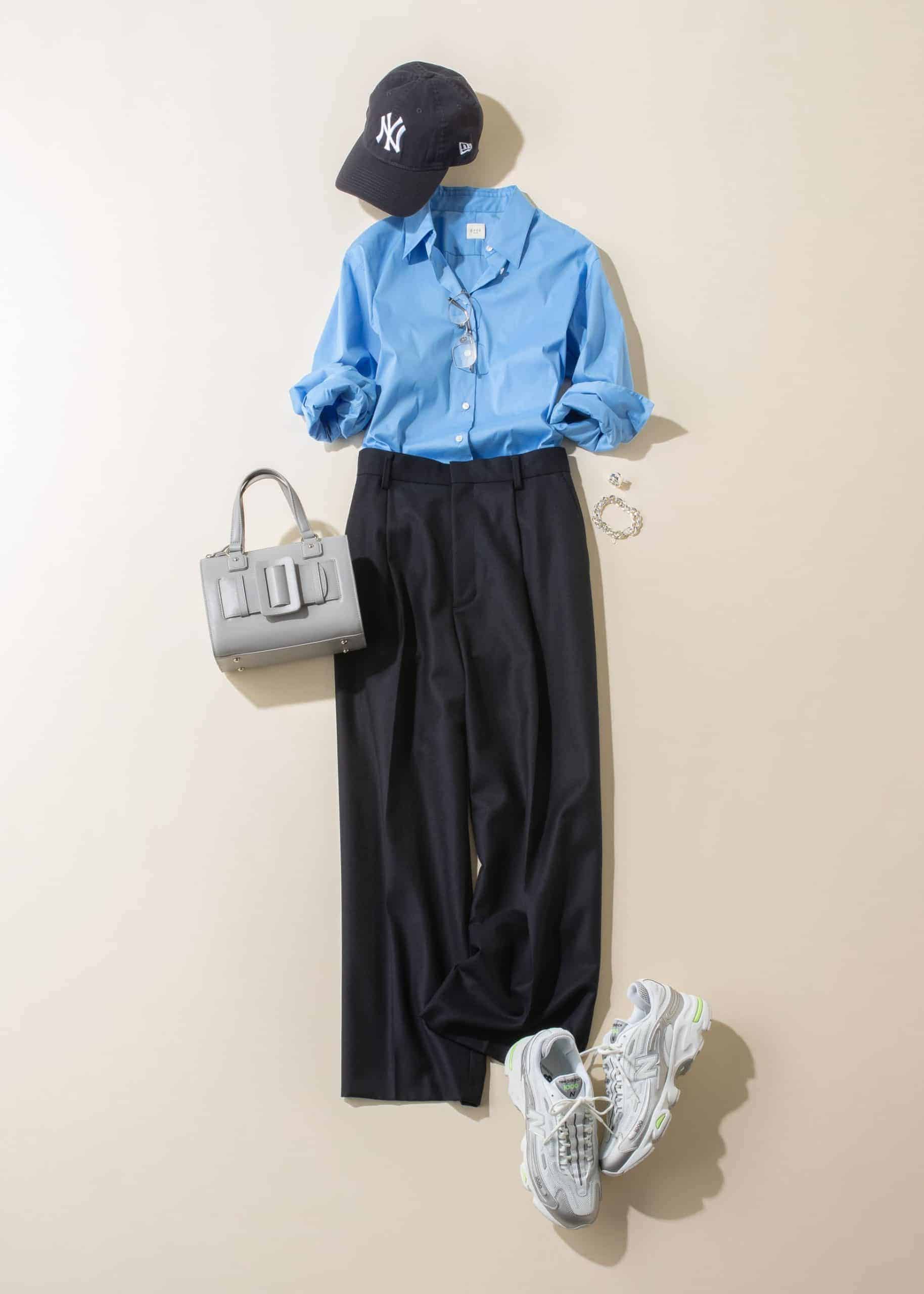 端正なブルーシャツコーデを、キャップとスポーティなNBで軽やかに崩した大人カジュアル。スニーカーのささいな黄緑の差し色が効いて、コンサバになりすぎず洗練された印象に。動きのある足元が、ワイドパンツの重さも自然に調整してくれます。