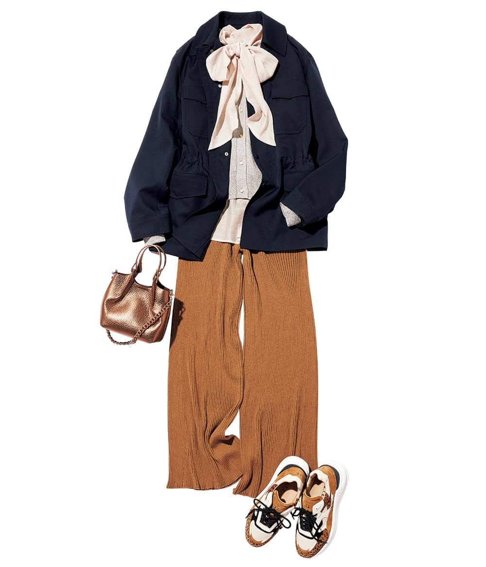 スニーカー¥44,000(デイト/ティースクエア プレスルーム)ミリタリージャケット¥77,000(ロエフ/エイチ ビューティ&ユース)カーディガン¥31,900ebure/リトルリーグ インク)ボウタイブラウス¥25,300(ウィム ガゼット/ウィム ガゼット 玉川髙島屋SC店)パンツ¥55,000(ハイク/ボウルズ)バッグ¥40,700ストラップ¥9,900(ともにジャンニ キアリーニ/ジャンニ キアリーニ 銀座店)