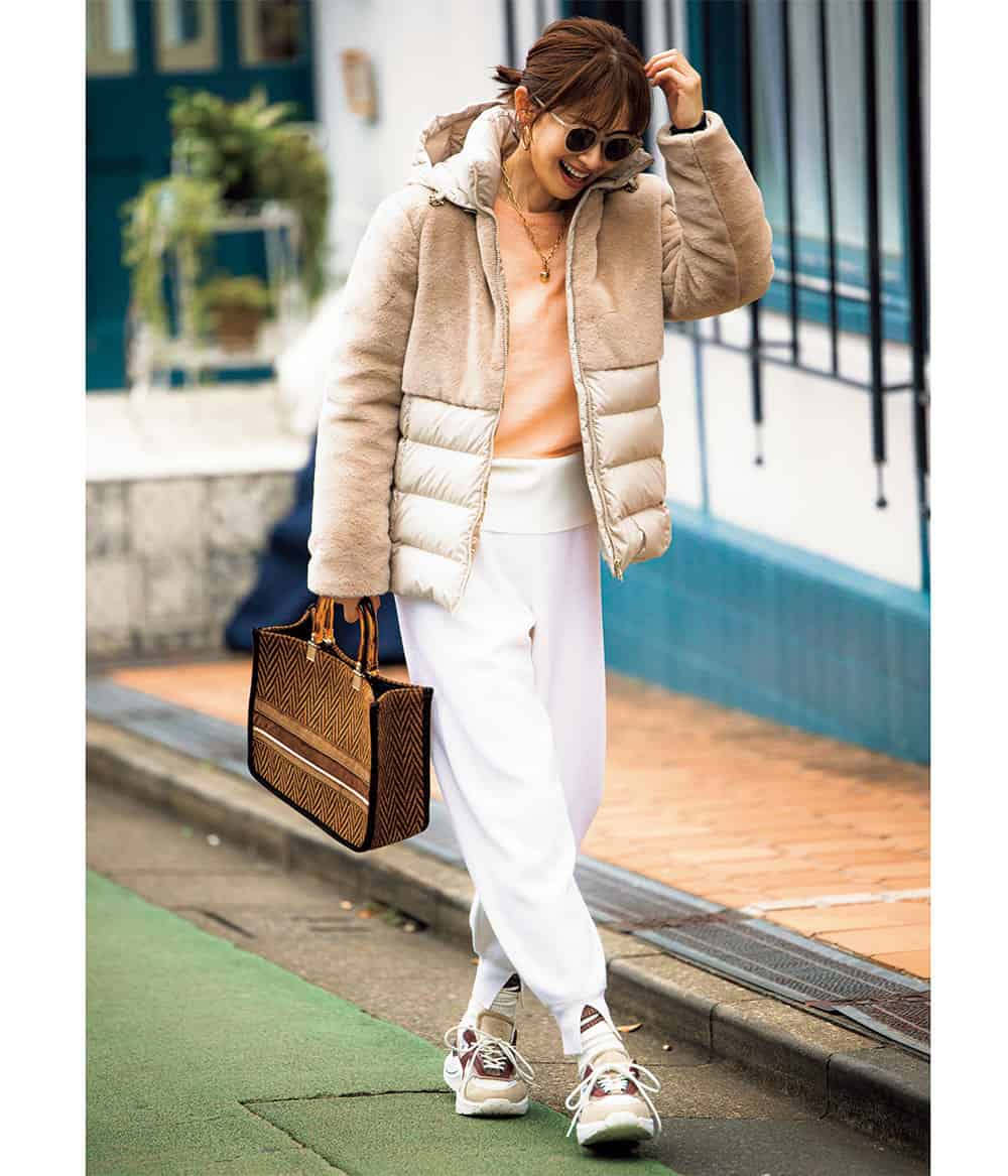 重たく見えがちな冬の着こなしには、スニーカーで軽さと抜け感をひとさじ。柔らかな上品カラーを合わせることで、季節感と洒落感のどちらも叶えられます。