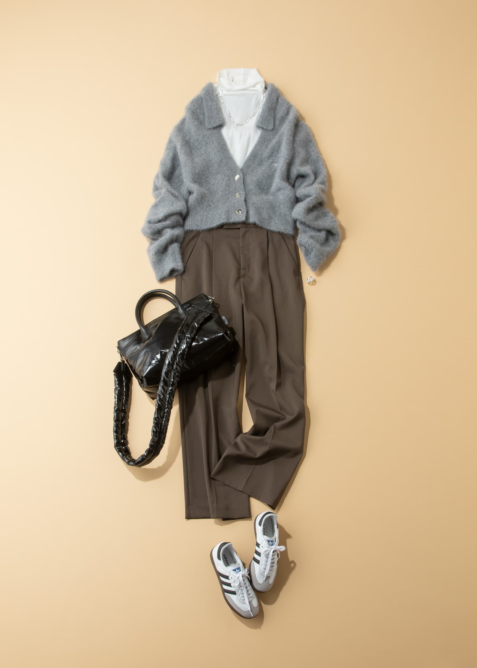 スニーカー「SAMBA OG」¥15,400(アディダス オリジナルス/アディダス ジャパン)ニット¥24,200(メゾンスペシャル)カットソー¥8,800(デミルクス ビームス/ビームス公式オンラインショップ)パンツ¥16,500(ノーブル×ローブ ブラン/ノーブル)バッグ¥37,400(ヴァジック/ヴァジックジャパン)ネックレス¥23,100リング¥9,900(ともにワンエーアールバイウノアエレ/ウノアエレ ジャパン)