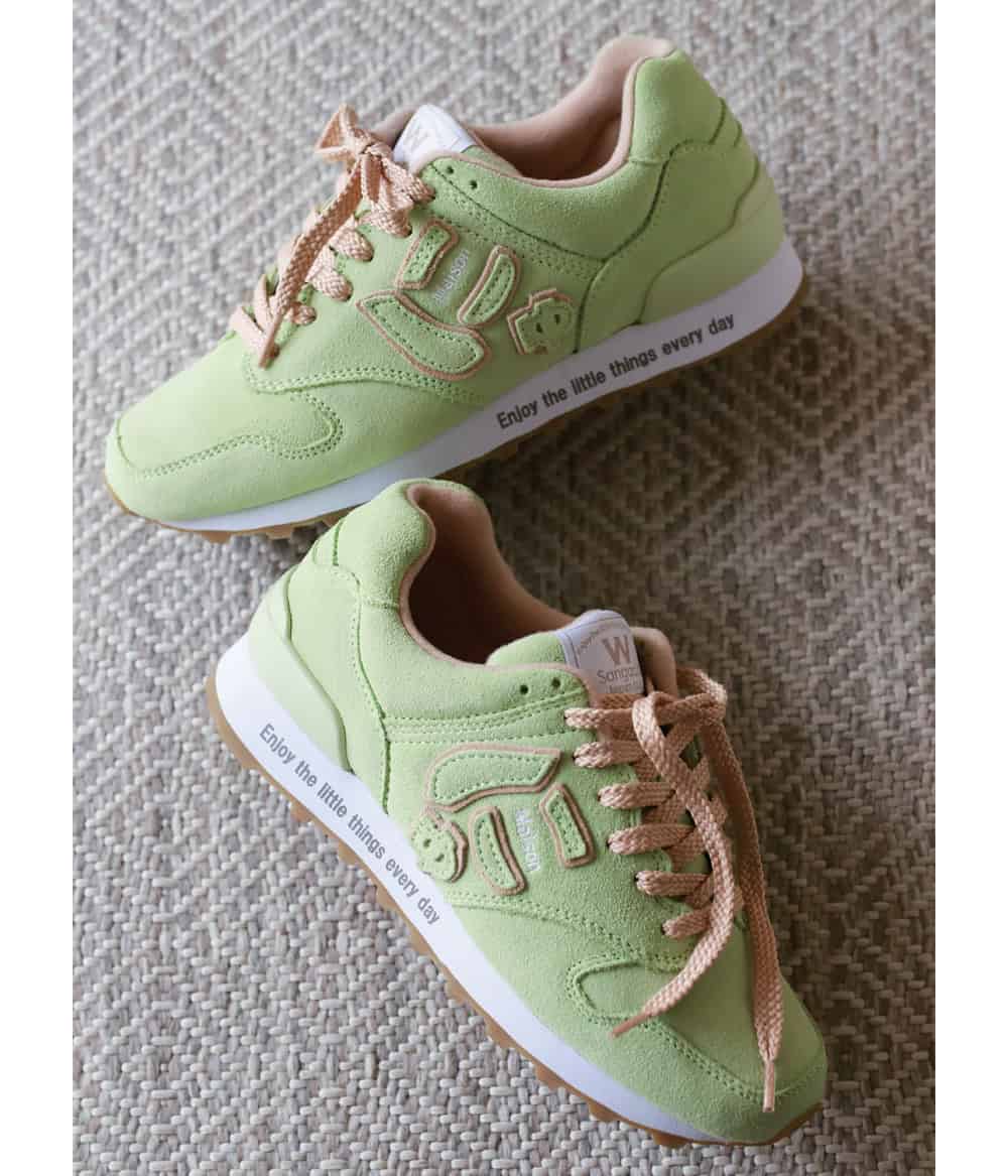 ワントーンのやわらかい冬コーデに、遊び心あるロゴとグリーンが映えるサンガッチョ。優しい色合いのアイテムと絶妙に馴染みながら、ほんのりテンションが上がるトキメキの一足です。ふかふかの履き心地で冬のお出かけがもっと楽しく。