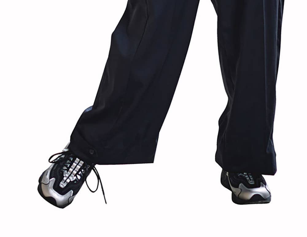 技ありデザインの黒ジャケットセットに、黒×白スニーカーがキレよく映えるスタイル。無地ベースのコーデだからこそ、スニーカーの立体感が引き立ち、足元がスタイリッシュなアクセントに。大人のきちんと感を損なわず、今っぽい抜け感のあるセットアップに仕上がります。