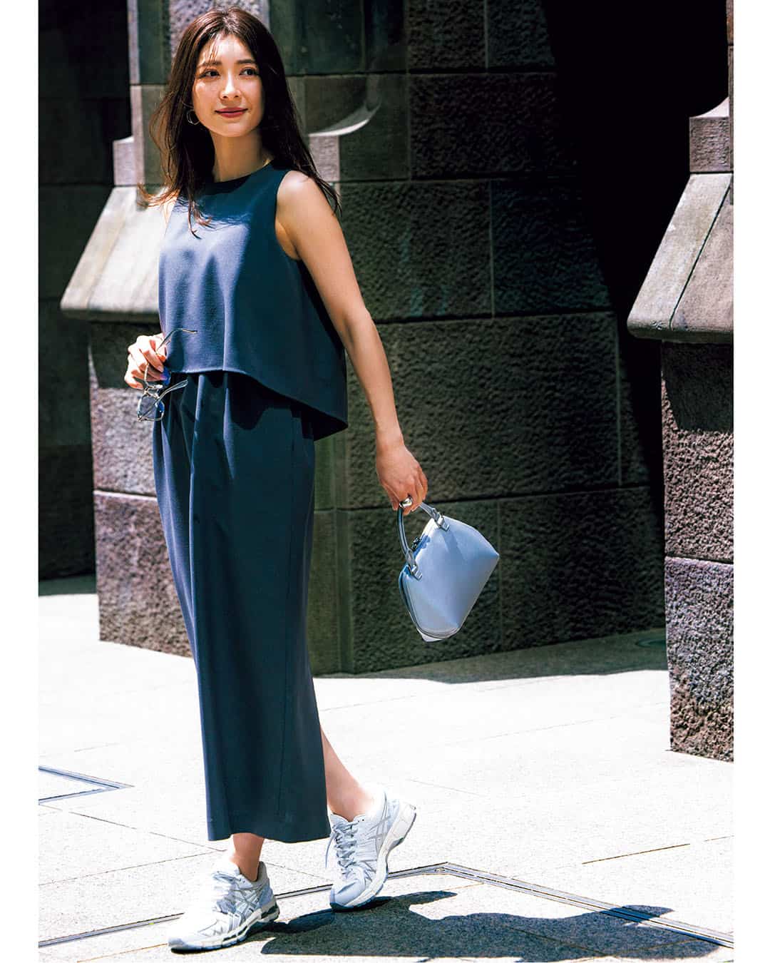 知的なブルーワンピに、同じブルートーンのアシックスを合わせたワントーン配色。足元を露出することで軽さが出て、涼しげな色気まで漂います。ローカットでスッキリ見え、スポーティ初心者でも挑戦しやすいバランスです。