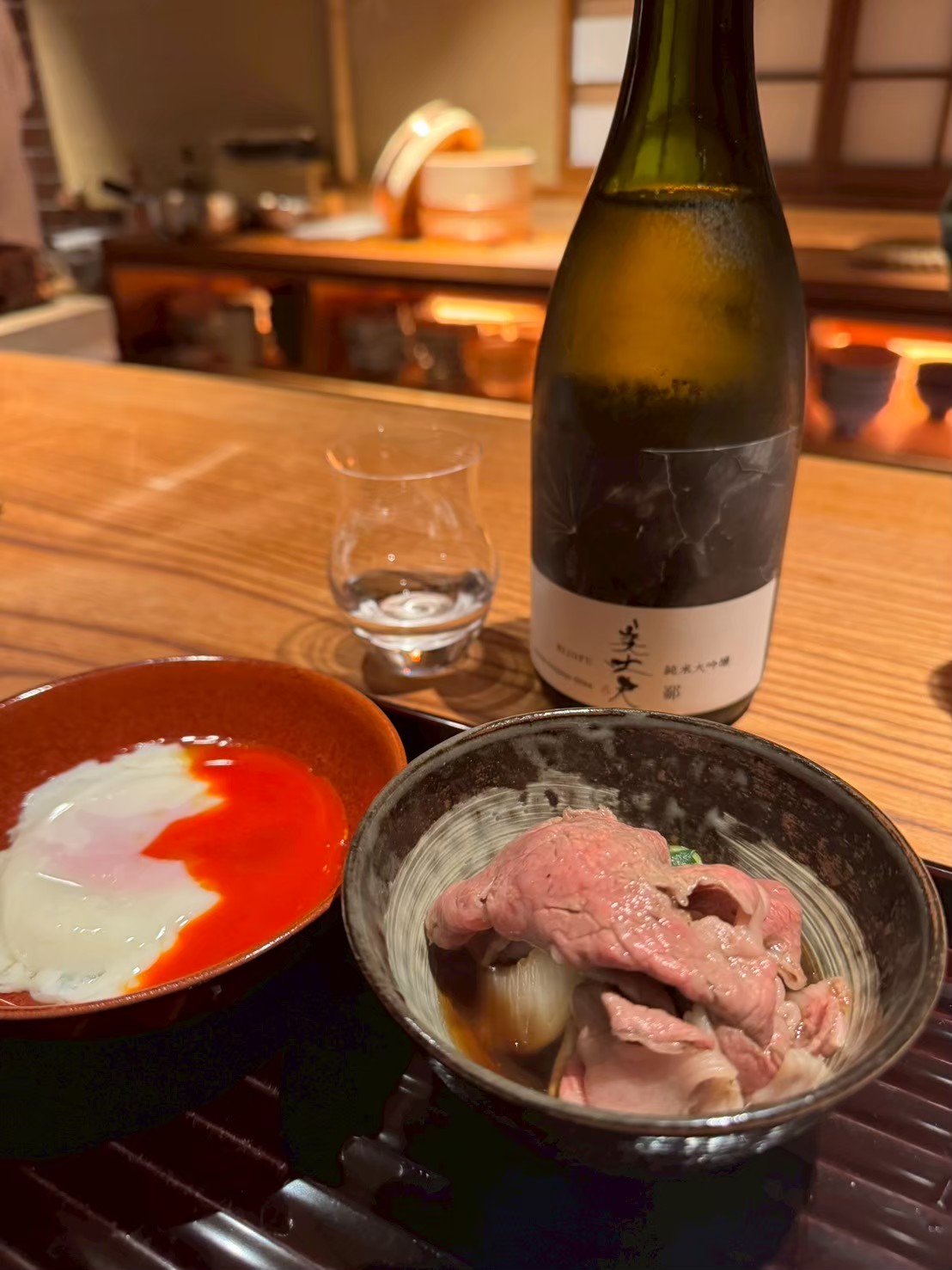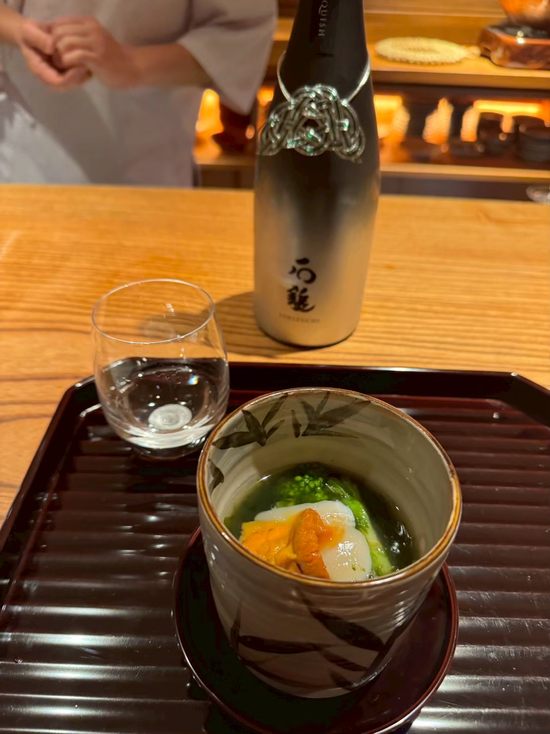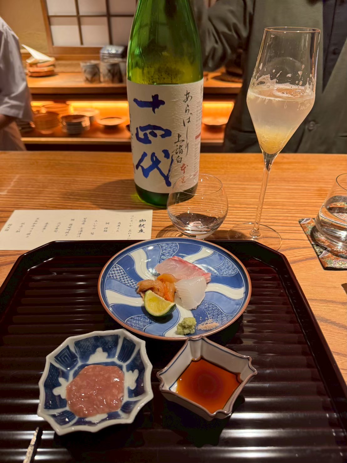 この日のコースでは、旬の素材を丁寧に生かしたお料理に加え、全国から集められた珍しい日本酒をグラスで少しずついただけました。料理に合わせて店主が丁寧にお酒を説明してくださり、香りや造り手の個性まで知ることで味わいが一層深まります。普段なかなか出合えない銘柄に出会うたび、心が弾みました。