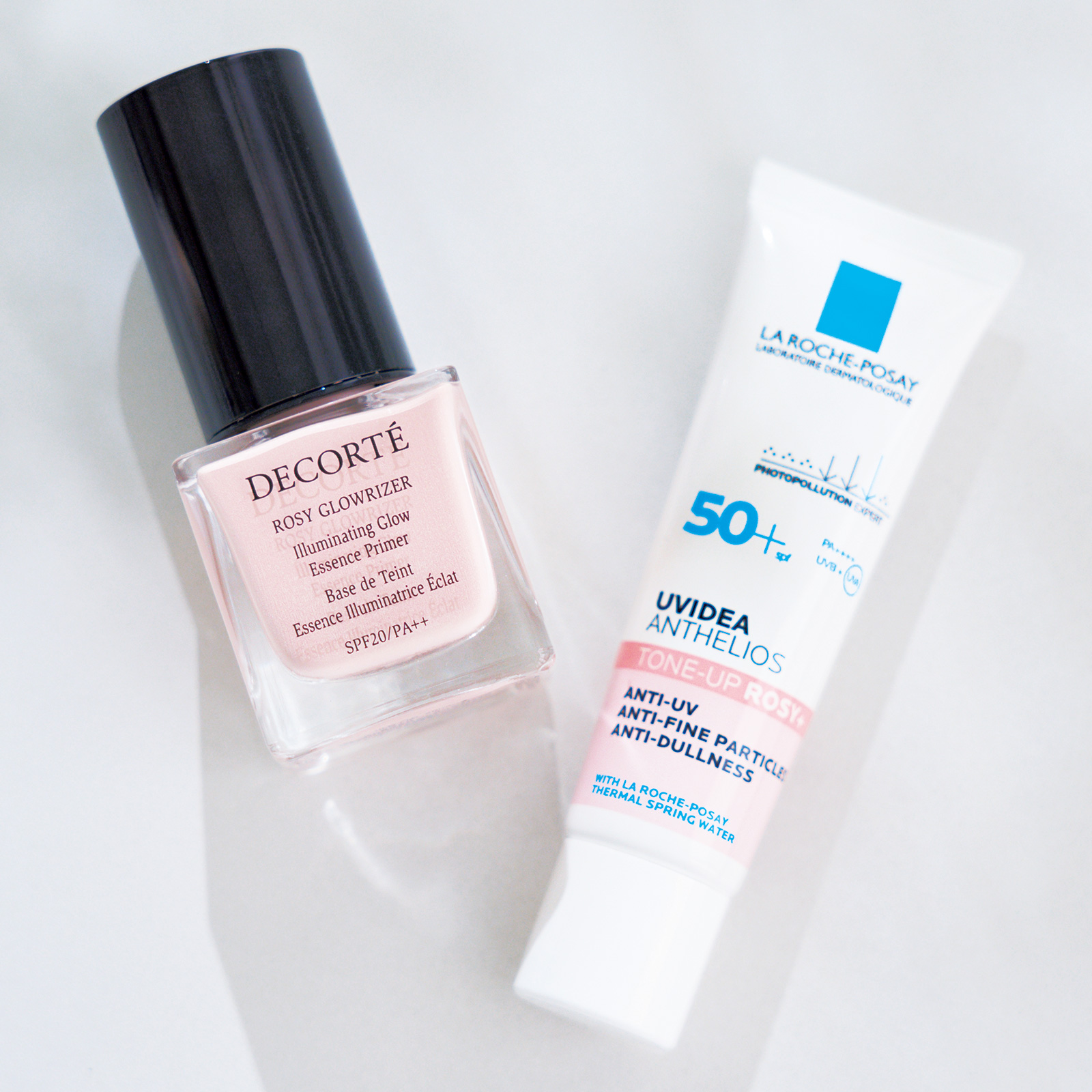 くすみ払拭に一役。左から:コスメデコルテのロージー グロウライザー、ラ ロッシュポゼのUV下地(ともに本人私物)