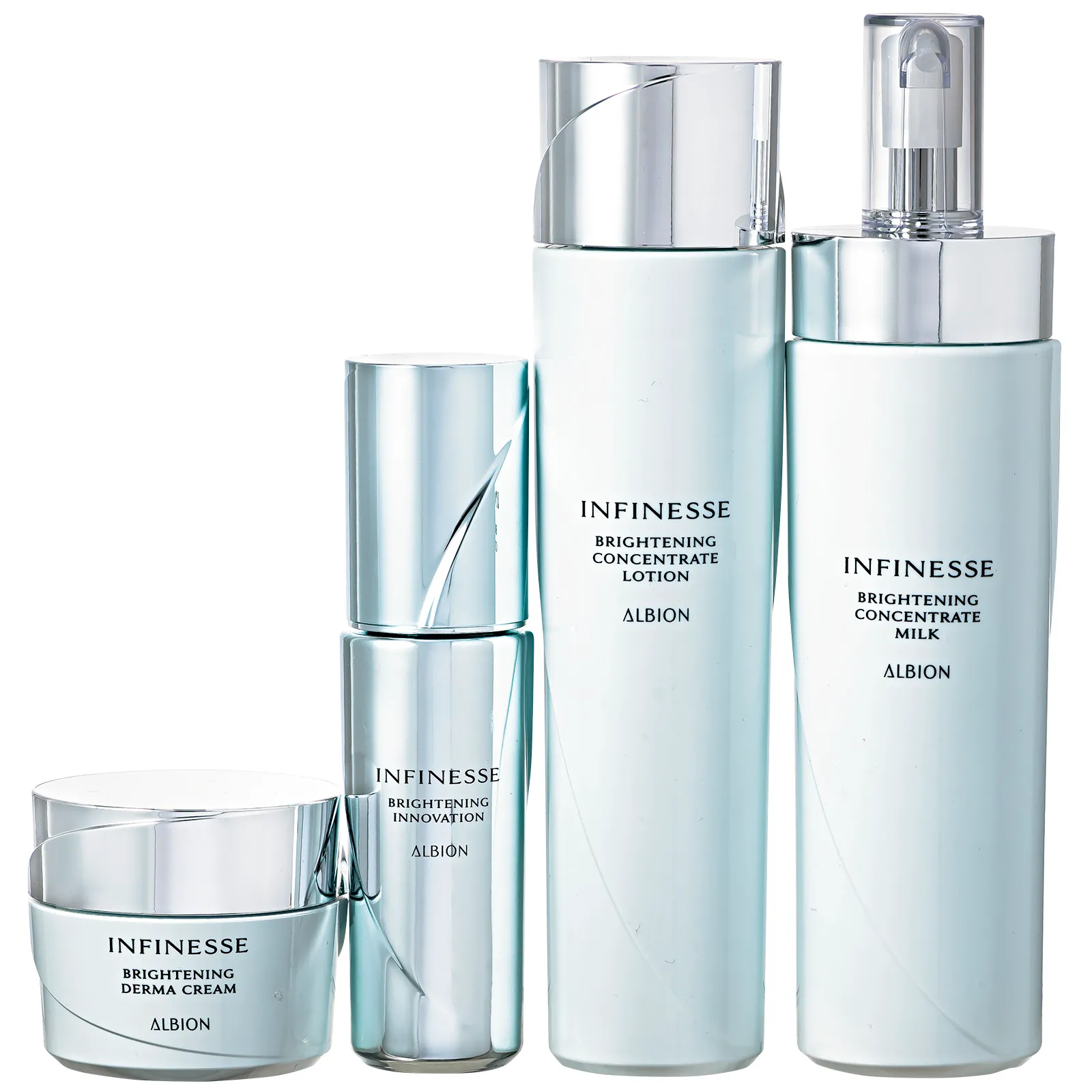 信頼のハリケアシリーズに美白ラインがデビュー。左から、ブライトニング ダーマ クリーム 30g ¥13,200ブライトニング イノベーション 40ml ¥11,000ブライトニング コンセントレート ローション 200ml ¥7,700同  ミルク 200g ¥7,700[すべて医薬部外品](すべてアルビオン)