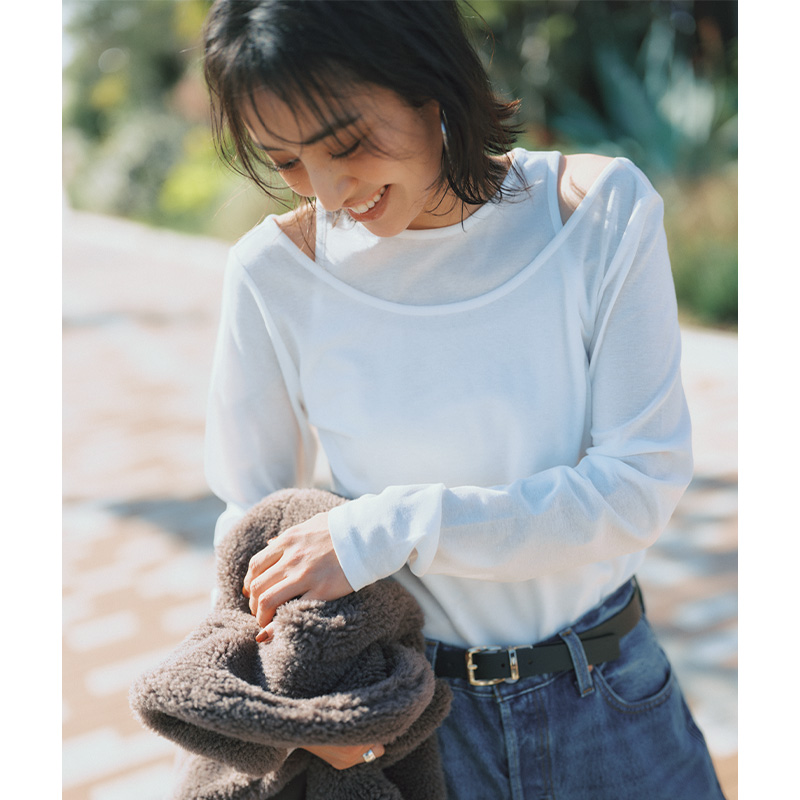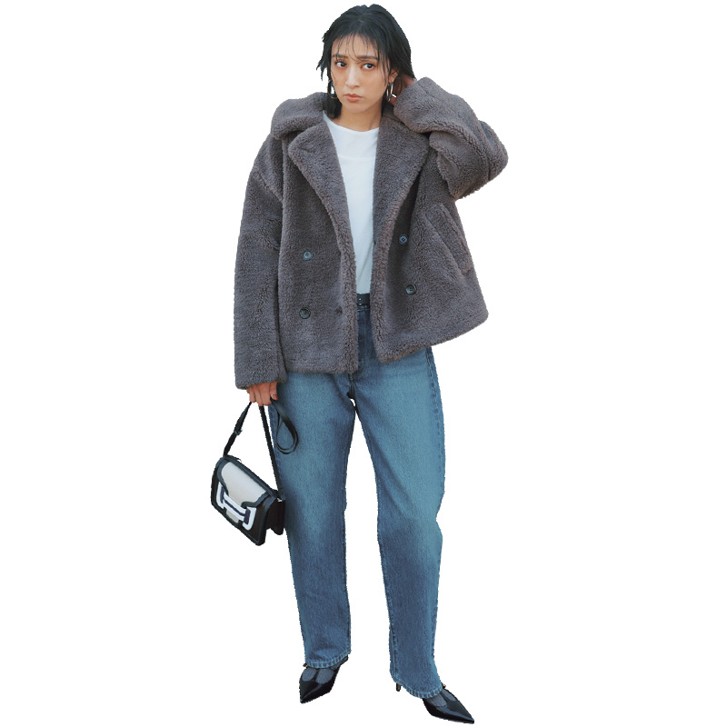 ボアコート¥49,940(23区/オンワード樫山 お客様相談室)レイヤードTシャツ¥15,400(アッパーハイツ/ゲストリスト)デニムパンツ¥15,400(リーバイス/ジャーナル スタンダード レリューム ルミネ新宿店)ピアス¥8,800(アビステ)リング¥30,800(スクア)ベルト¥14,300(レフィエ/フラッパーズ)バッグ¥157,300(ピエール アルディ/ピエール アルディ 東京)ソックス¥1,320(靴下屋/タビオ)ミュール¥69,300(ペリーコ/アマン)