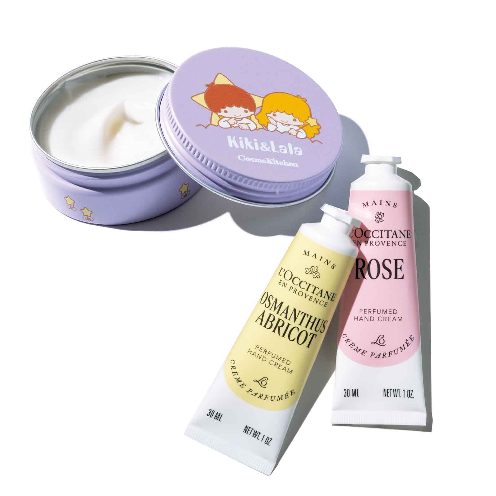 左/キキ&ララの50周年を記念したコラボアイテム。Kiki&Lala 缶入りハンドクリーム 30g ¥1,540(コスメキッチン)右/リッチな香りとスルスル伸びるテクスチャーが◎。オスマンサスアブリコ パフュームド ハンドクリーム[左]、ローズ 同[右]、各30ml 各¥1,870(ともにロクシタンジャポン)