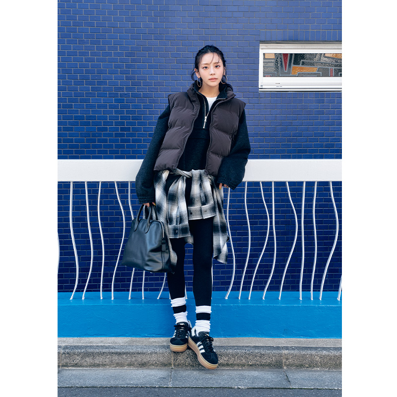 ショートダウンベスト¥6,590(ZARA)ハーフジッププルオーバー¥253,000(ポステレガント)タンクトップ¥8,580(スローン/ザ ショップ スローン 新静岡セノバ店)レギンス¥5,940(YURYUR)チェックシャツ¥25,300(プランクプロジェクト/プランクプロジェクト 青山店)ピアス¥26,400(ブランイリス/ブランイリス トーキョー)バッグ¥737,000(ヴァレクストラ/ヴァレクストラ ジャパン)スニーカー¥17,600(アディダス オリジナルス/アディダスコールセンター)ソックス/スタイリスト私物