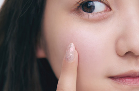 3.ペールラベンダーのcを頬の中央に点置きし、指で広めになじませる。繊細なピンクパールが肌にピュアな血色を灯し、なめらかな光沢を与える。