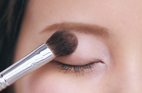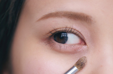 2.bをブラシでMIXし、目頭側の広範囲にふわりと。シマーなペールピンクとホワイトシルバーが輝くブルーで、目元に澄んだ透明感を纏わせる。