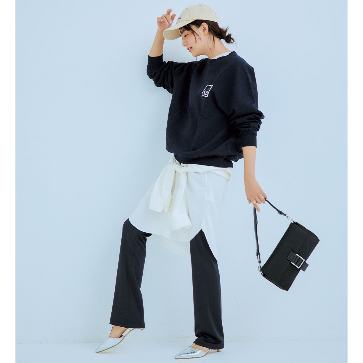 スウェット×レギンスの定番コンビは、シャツの腰巻きでひと工夫を。ヒップ位置でシャツのボタンを留めて袖を結べば、スカート感覚で気になる腰まわりも自然にカバーできます。足元はポインテッドトゥシューズ、バッグはスクエア型を選び、キレイめに引き寄せて。