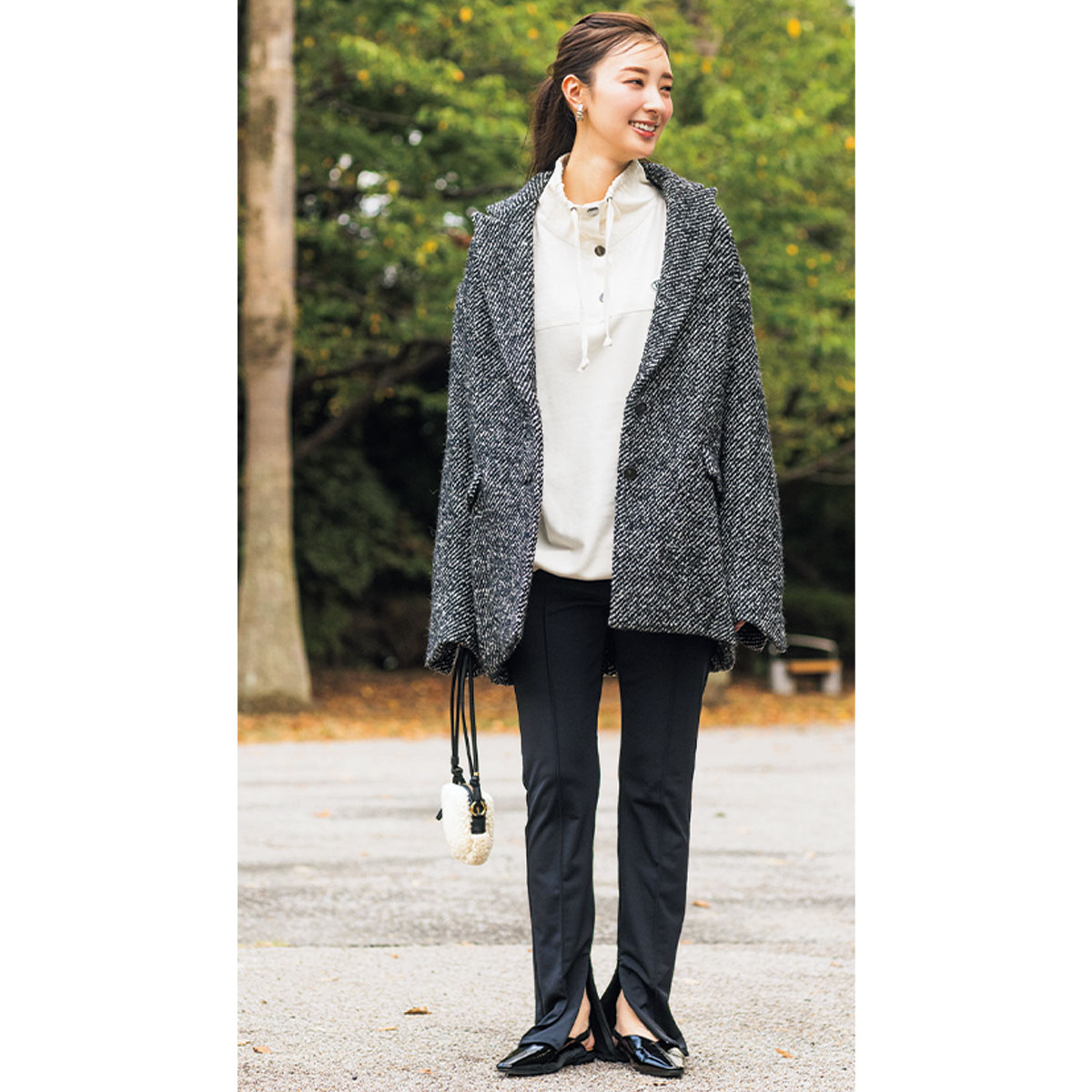 カジュアルな印象が強いアノラックトップスは、キレイめアイテムで引き算するのが30代の正解。クラシカルなヘリンボーン柄のジャコットを羽織ることで、レギンススタイルも一気にスマートな表情に。縦ラインを強調してくれるシルエットで、動きやすさと大人っぽさを両立。