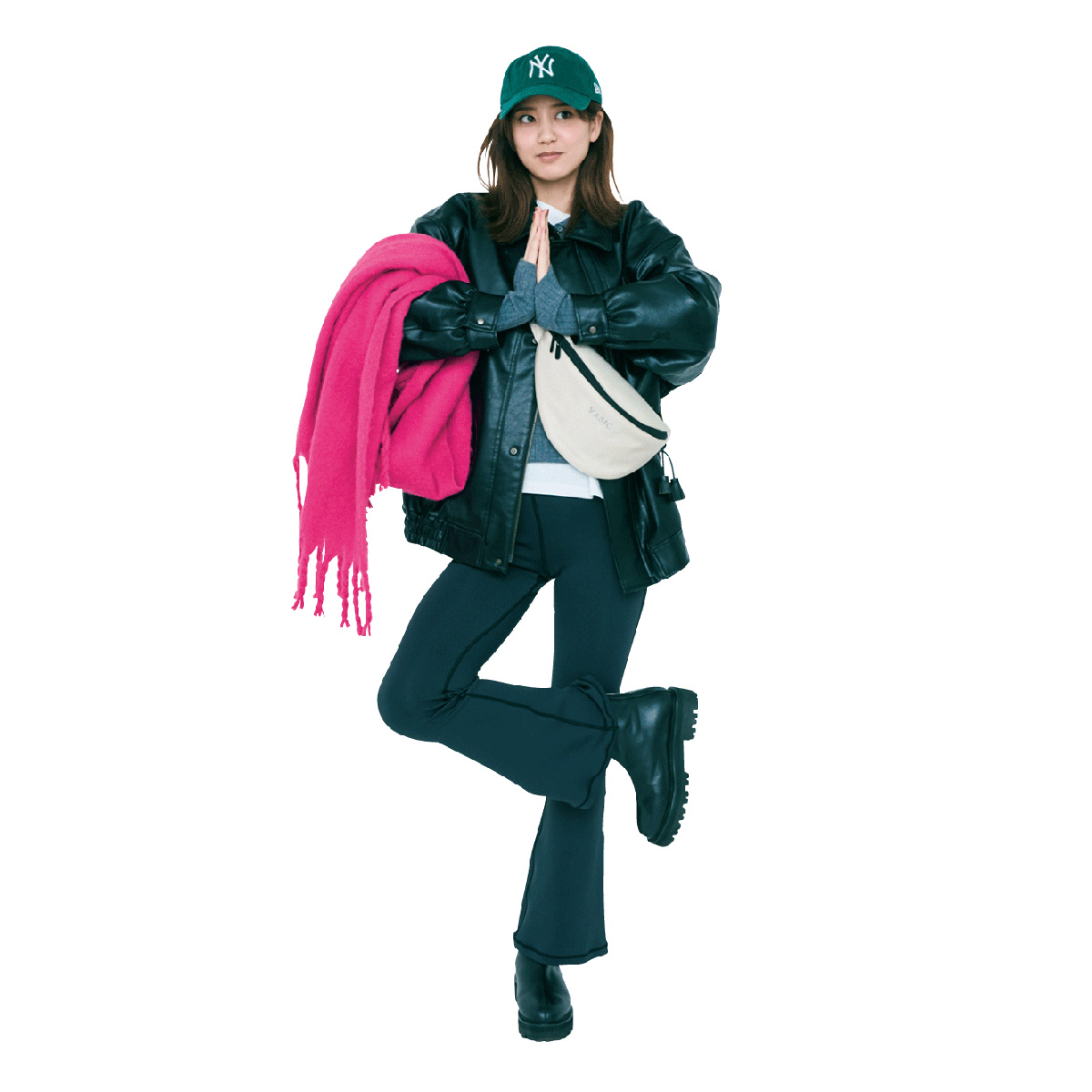 フレアレギンス×レザー風ジャケットが着痩せに貢献