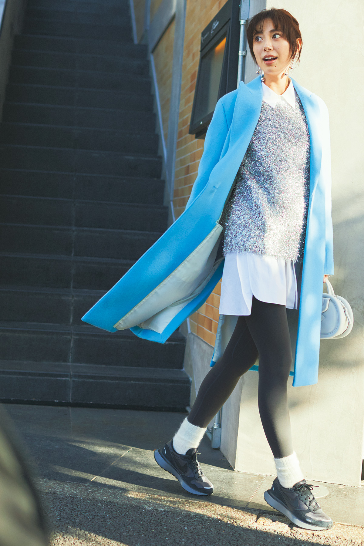 スポーティな黒レギンスも、起毛感が可愛い白モヘアソックスを重ねることで、グッと洒落た印象に刷新。寒さ対策になるうえに足元にリズムが生まれ、重く見えがちな冬コーデも軽やかに仕上がります。ラメニット×白シャツのレイヤードで、カジュアルの中にキレイめ要素をひとさじ。