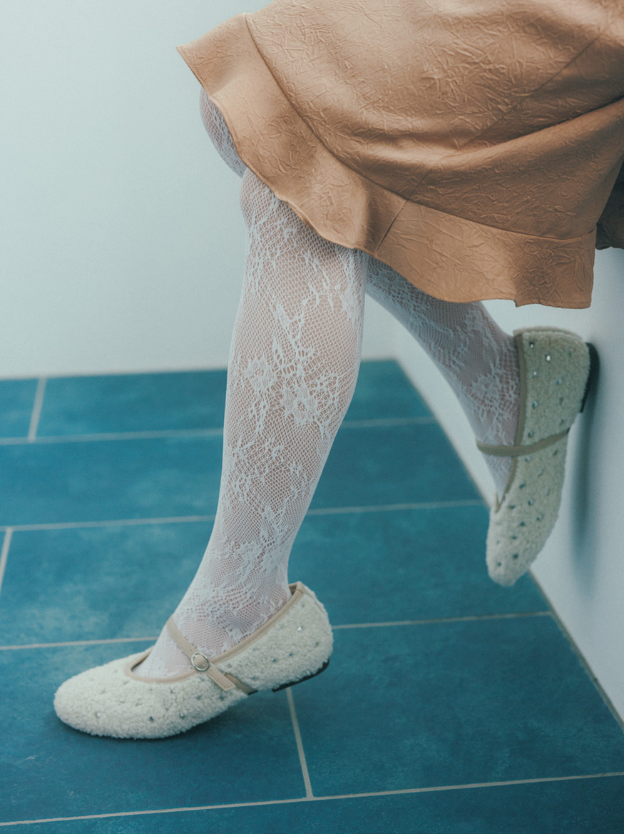 淡いピンクタイツに水色レースのタイツをレイヤードする新しいスタイルにトライ! レースタイツ¥1,650/靴下屋(タビオ) 中に履いたタイツ¥2,200/ぽこ・あ・ぽこ シューズ¥7,700/オリエンタルトラフィック(ダブルエー) スカート¥28,600/バウム・ウンド・ヘルガーテン(S&T)