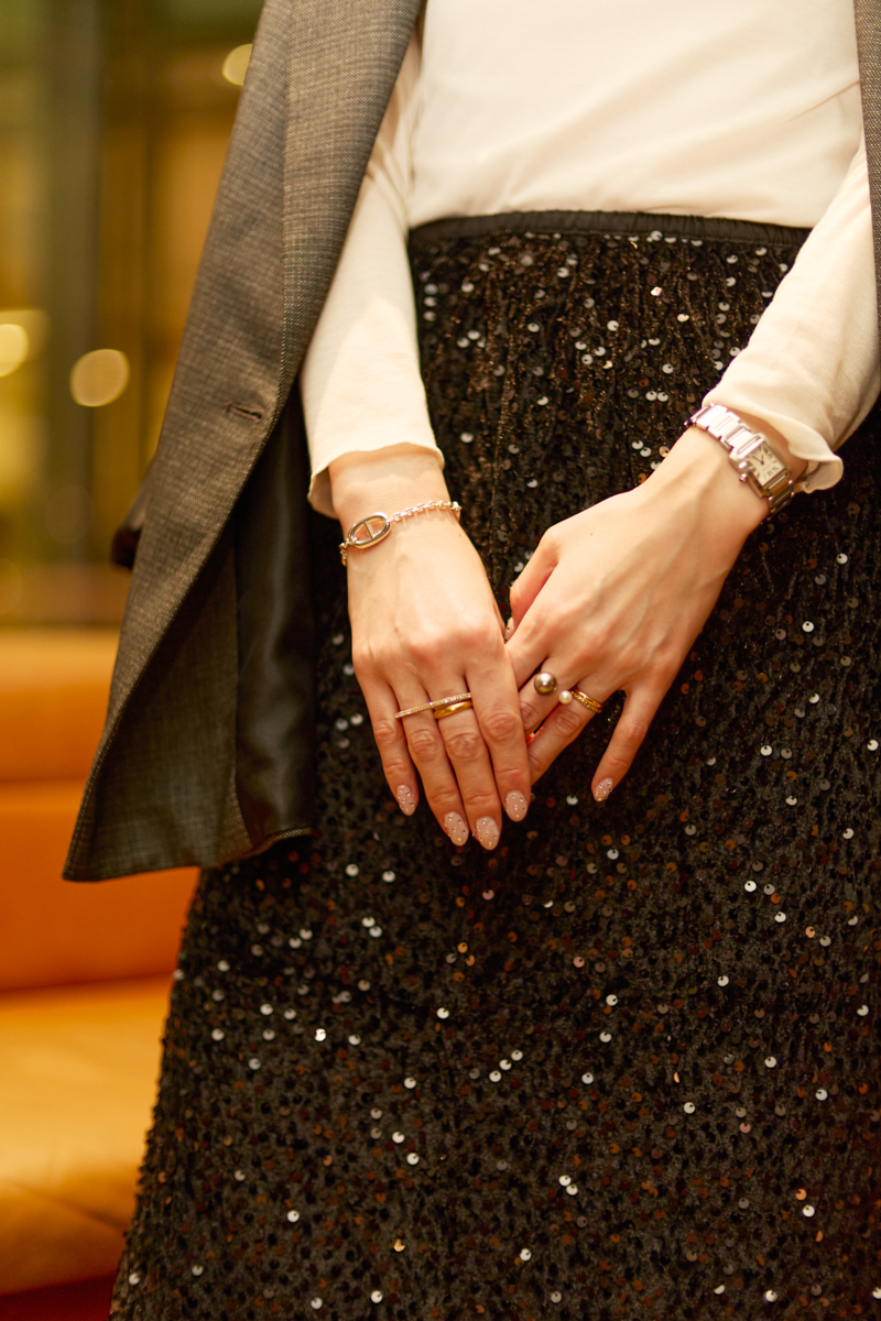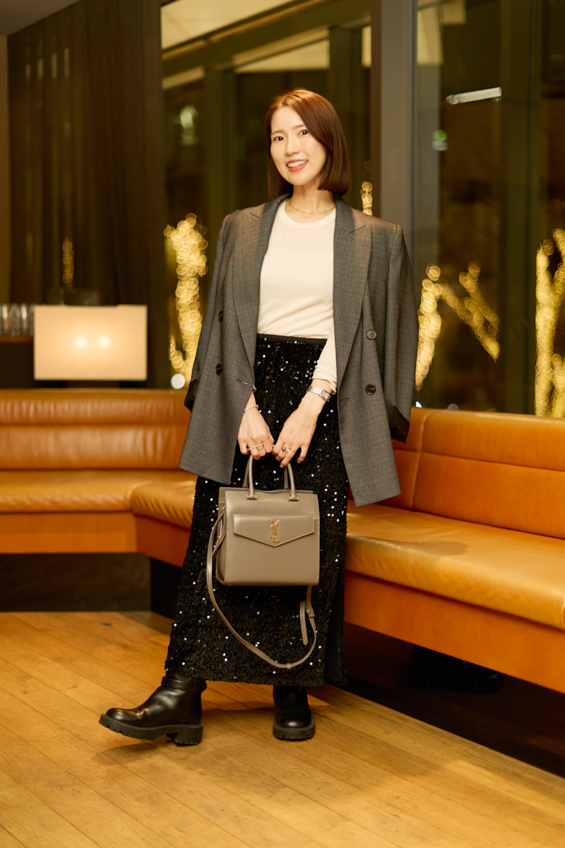 「華やかな場での装いは、ベースはシンプルにまとめてどこか1つだけ主役を作るようにしています。今日はエミリーのスパンコールスカートを主役に、この秋ザラで購入したジャケットと合わせました」