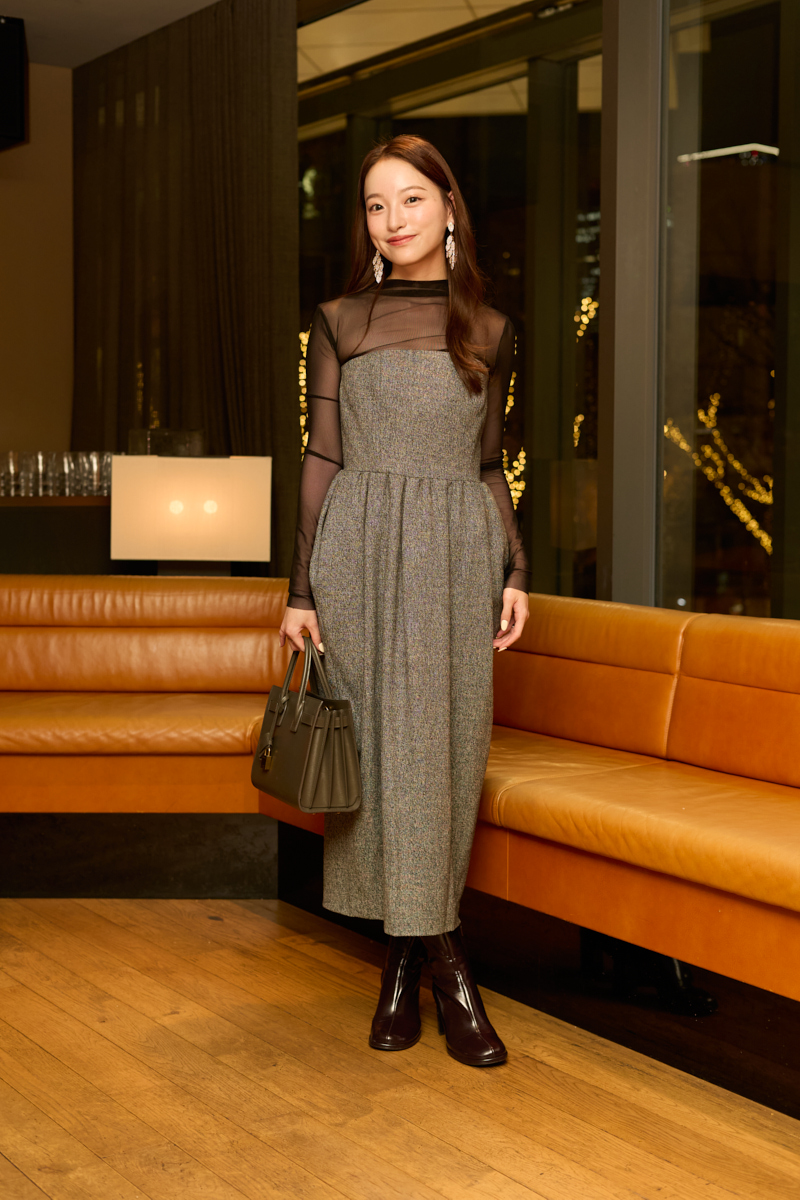 「インナーのシアートップスの上品な肌見せとワンピースのひと癖あるデザインがお気に入りです。シーニュのワンピースは昨年購入。1枚で着るのはもちろん、季節やTPOに合わせてインナーにタートルネックのヒットを合わせることも。カジュアルダウンしたい時は白スニーカー、パーティやディナーではパンプスなどを合わせて、さまざまなシーンで活躍してくれています」