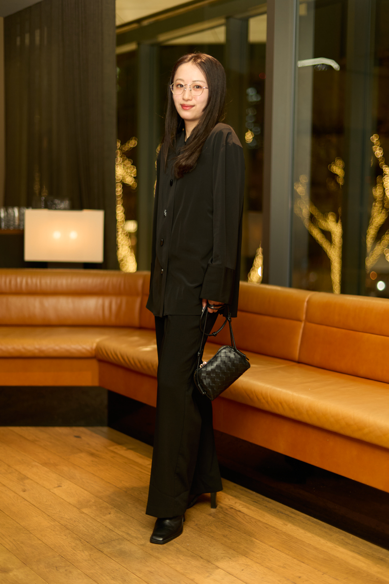 「今日は全体的にモード系にまとめ、クールさを意識したスタイリングに。AKIRANAKAのシャツジャケットは美しいシルエットが魅力で、石のボタンがさりげないアクセントになっていて特別な日に纏いたくなる1枚です。オールブラックだと重たい印象になりがちなので、メタルフレームのメガネで抜け感をプラスしました。人が集まる場では、シルエットや素材にこだわって、派手になりすぎないようにカラーは抑えめに、ディテールでエッジを効かせるようにしています」