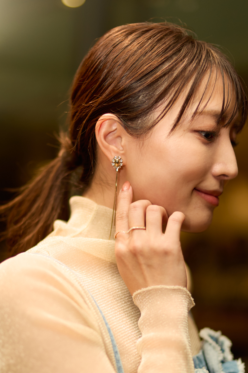 「シアートップスの細かいキラキラがほどよく、顔映りをよくしてくれます。アクセサリーは大ぶりなものにして、やりすぎない程度にキラキラ感を足しました」