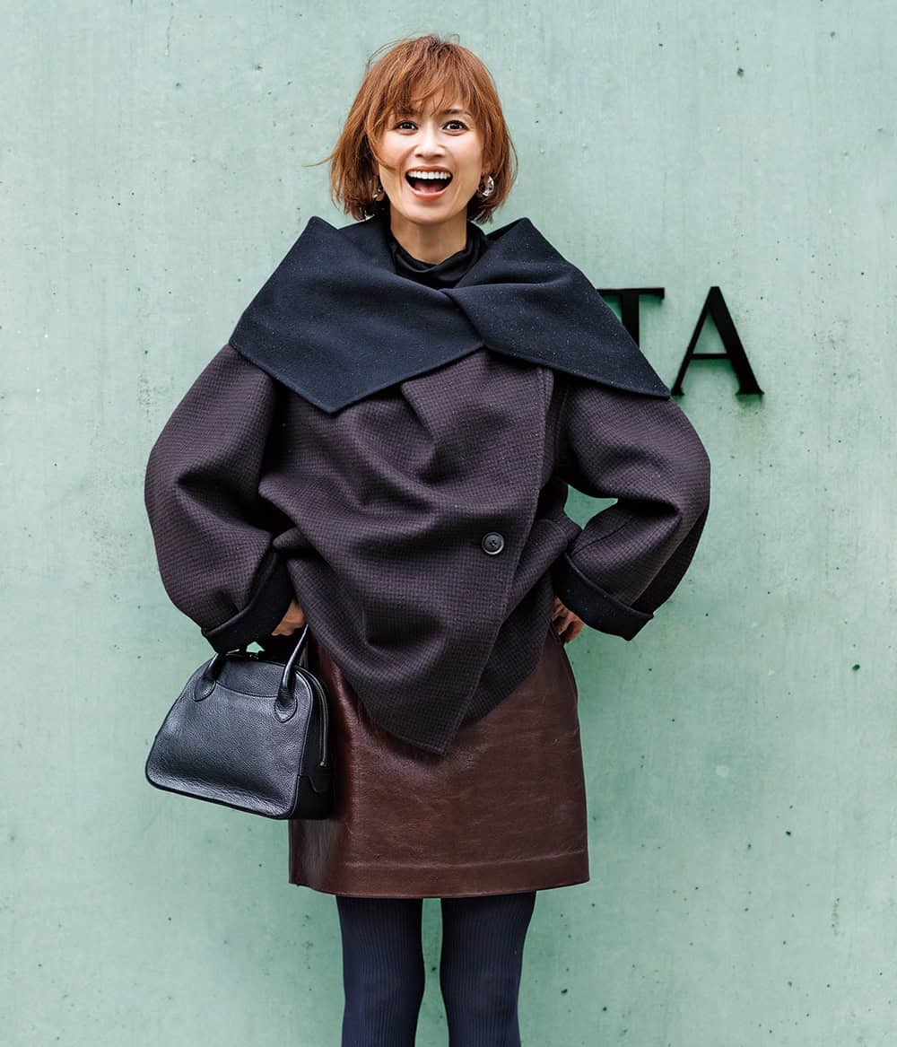 大人のワントーンコーデ。ボリュームのあるアウターで重心を引き上げればスタイルアップ効果も抜群。