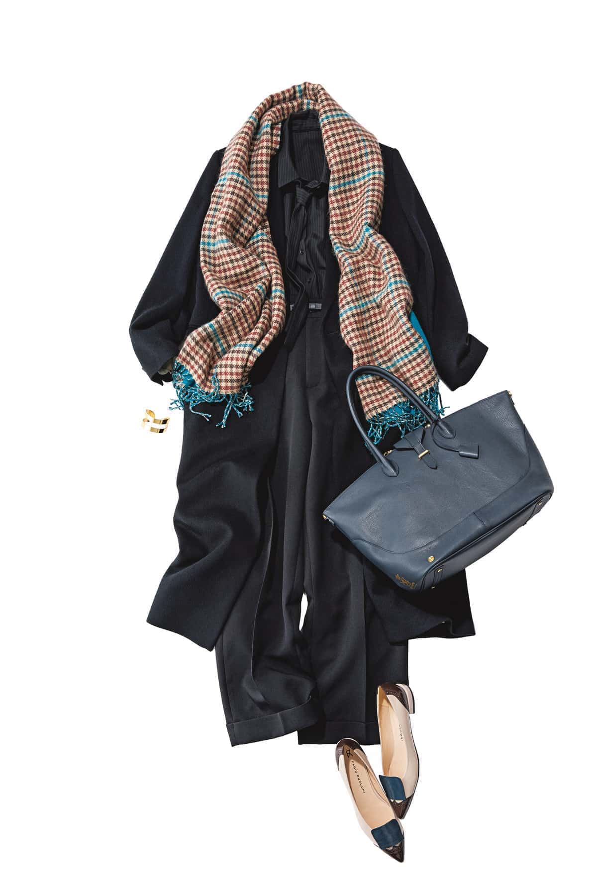 ストール¥3,890(スタディオクリップ/アダストリア)コート¥79,200(エモエレ/アダム エ ロペ)ボウタイ付きシャツ¥19,800(ヴェルソー/ジオン商事)パンツ¥13,200(マルゥ/ユナイテッドアローズ カスタマーサービスデスク)ベルト¥11,000(レフィエ/フラッパーズ)バッグ¥176,000(A.D.M.J./アクセソワドゥマドモワゼル)フラットシューズ¥34,100(ファビオ ルスコーニ/伊勢丹新宿本店 本館2F 婦人靴)バングル¥4,400(アビステ)