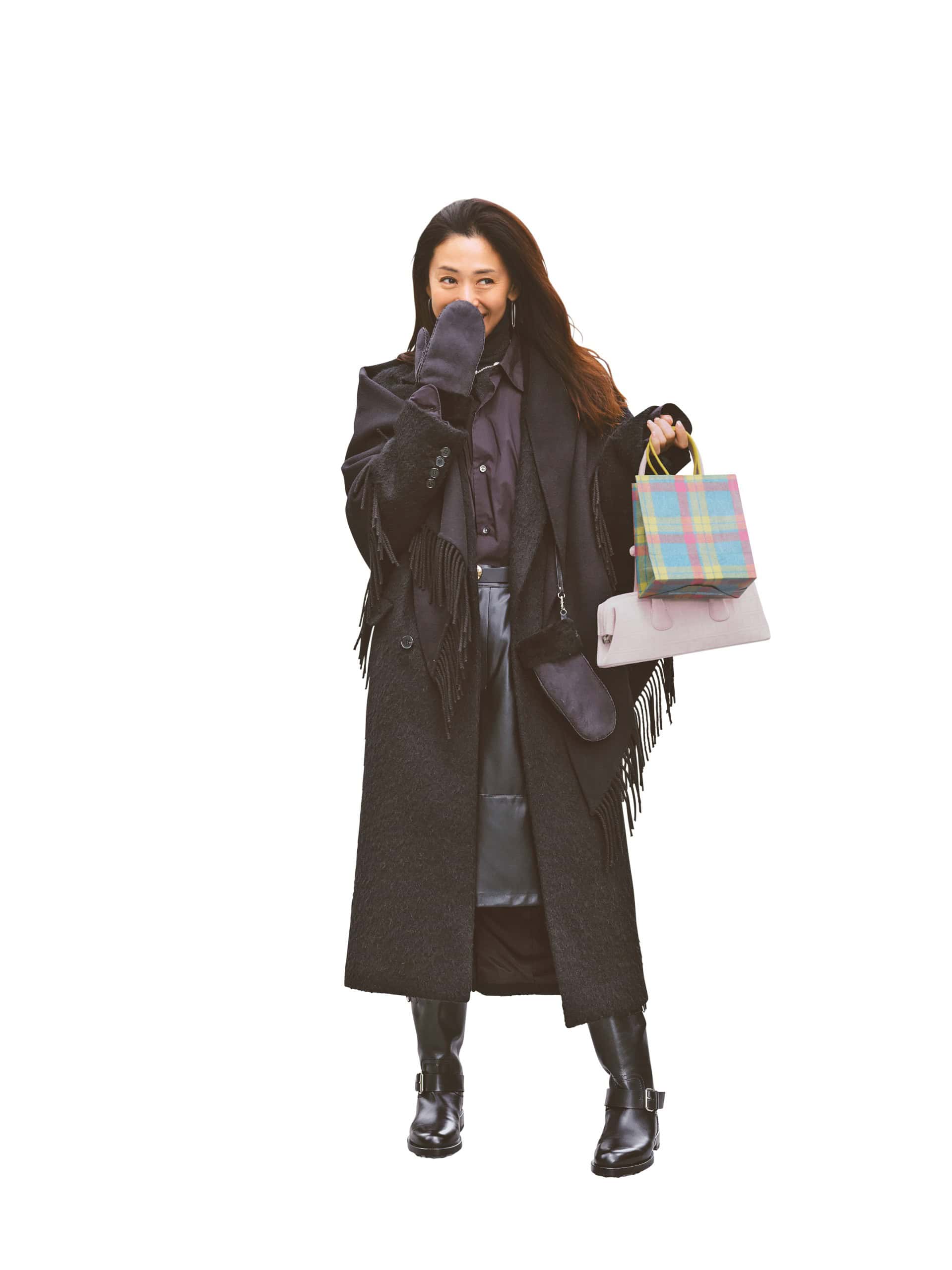 スカート¥49,280(TELA/ティースクエア プレスルーム)コート¥69,300(ジャーナル スタンダード レサージュ/ジャーナル スタンダード レサージュ 銀座店)ニット¥29,700(サクラ/インターリブ)バッグ¥157,300(ピエール アルディ/ピエール アルディ東京)ブーツ¥97,900(ペリーコ/アマン)ピアス¥41,800リング¥46,200(ともにブランイリス/ブランイリス トーキョー)タイツ/スタイリスト私物