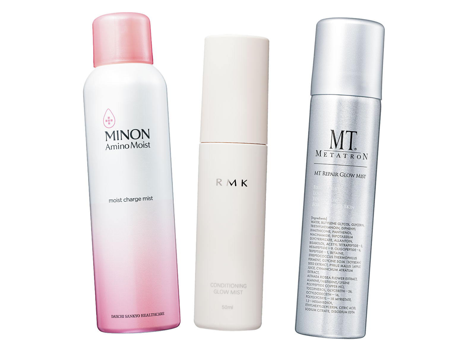 左から:吸着ヒアルロン酸配合。角質層まで浸透し保湿。ミノン アミノモイスト モイストチャージ ミスト150g ¥2,090〈編集部調べ〉(第一三共ヘルスケア)オイルとうるおいの2層式タイプ。乾燥による崩れや毛穴落ちを防ぎ透明感が復活。RMK コンディショニング グロウミスト50ml ¥3,300(RMK Division)霧のように超微細なミスト。美容成分たっぷりのうるおいが重なり、しっとり肌に。MTメタトロン MT リペア グロウ ミスト 60ml ¥5,940(MTコスメティクス