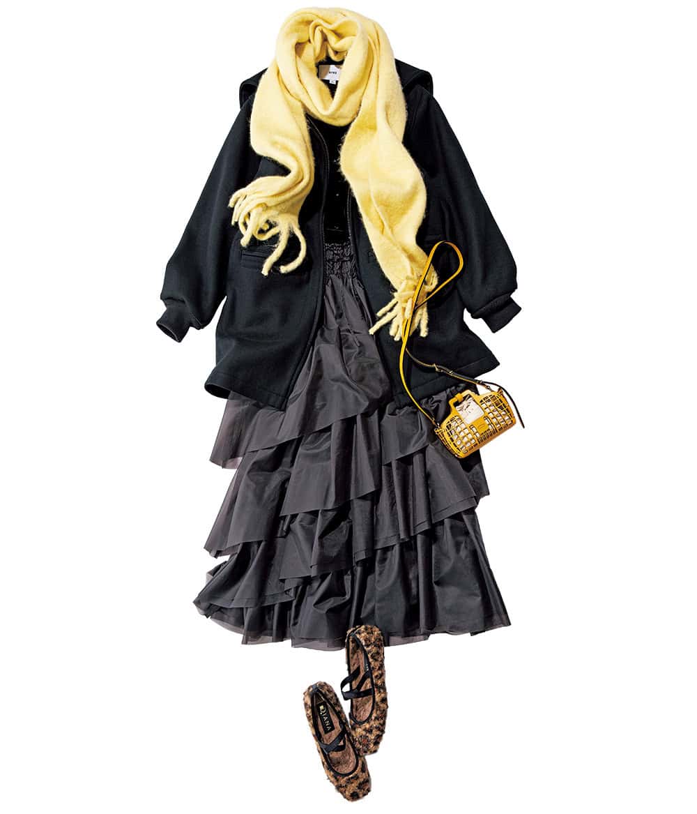 親しみやすい〝バターイエロー〟のモコモコした素材のマフラーが可愛さを割り増し。全身黒の重さが、持ち前の若々しさを打ち消し老け見えする懸念がある時は、まずは顔周りを明るく。得意の甘盛りスカートは、黒の時こそ大胆に。