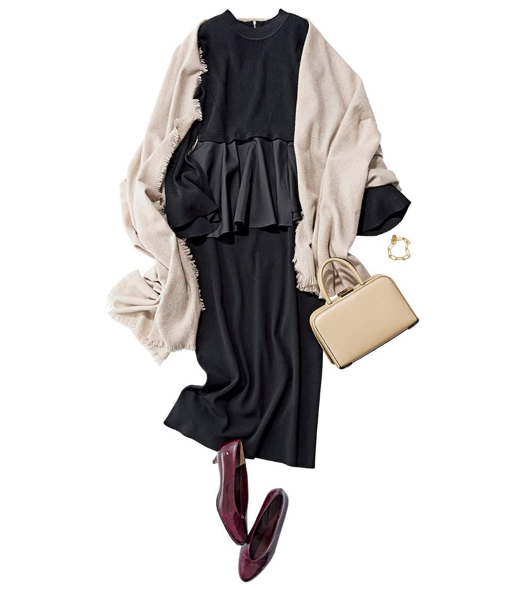 品格ある大人顔には上質な巻き物がマッチ。大判ベージュが黒の分量を調節し、ウールと色の柔らかさで女性らしさを引き上げ。ペプラムの甘さで脱シンプルに。