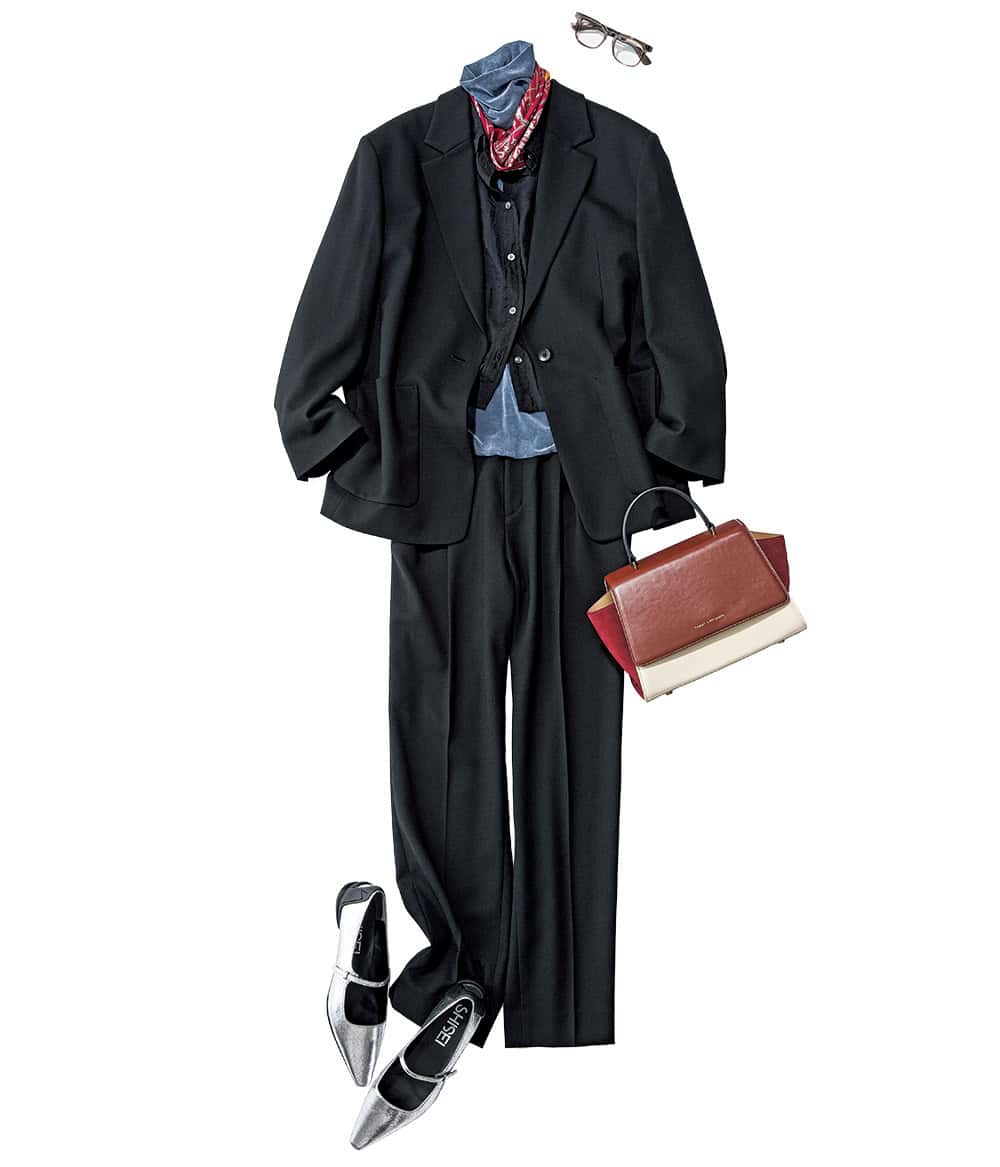 得意のマニッシュなジャケパンスタイルも、ほぼクロだと時に近寄りがたい印象に。大人顔に映える深みある色のスカーフで、黒の強さを和らげながら華やぎを。