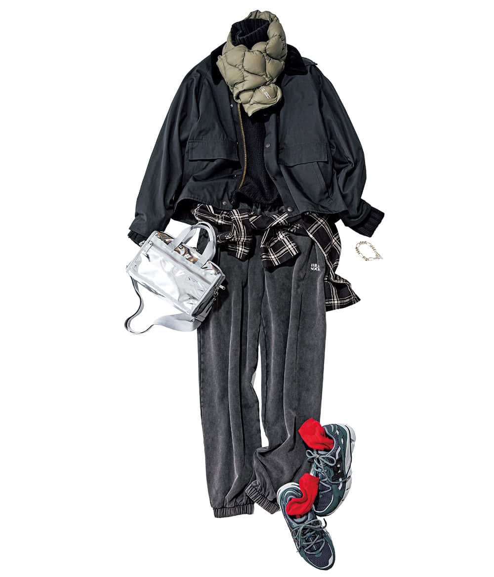 ダウンマフラー¥7,700(エフシーイー® × タイオン/F/CE. Flagship Store Tokyo)ハンティングジャケット¥47,300(バブアー × フリークス ストア/フリークス ストア 渋谷)ニット¥28,000(バナナ・リパブリック)シャツ¥55,000(プラームス フォー コンテ/コンテ 青山店)スウェットパンツ¥27,500(ザ ニュー ソサエティ/THIRD MAGAZINE)バッグ¥24,200(レスポートサック/レスポートサック カスタマーサービス)スニーカー¥19,800(カルフ/シードコーポレーション)ソックス¥880(靴下屋/タビオ)ブレスレット¥18,700(アドラル/ZUTTOHOLIC)