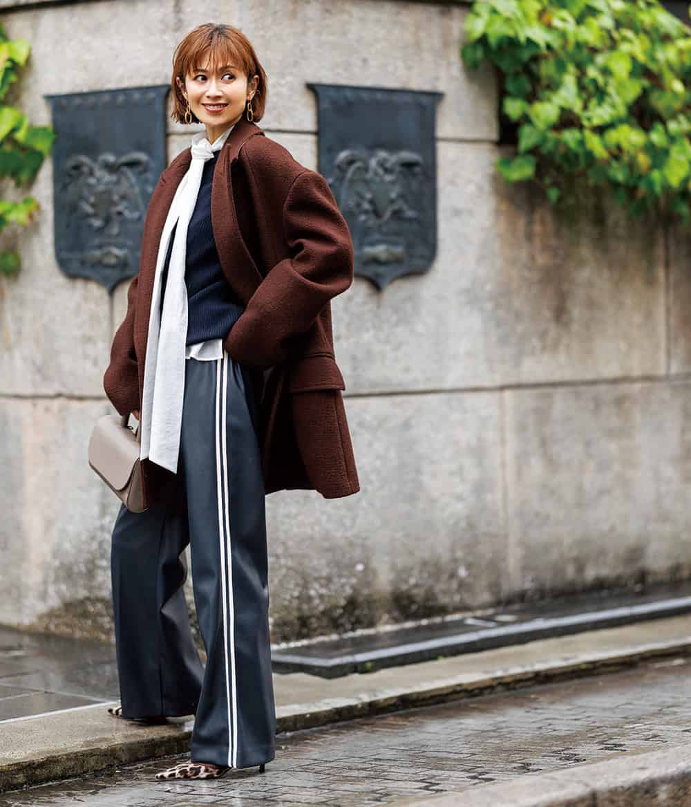 パンツ¥49,500(サードマガジン)コート¥154,000(エストネーション)ニット¥25,300(HER.)中に着たボウタイブラウス¥39,600(エブール/リトルリーグ)バッグ¥85,800(サルチェ/フラッパーズ)パンプス¥33,000(ハァウ/ウィム ガゼット 玉川髙島屋S・C店)ピアス¥8,800(ワンエーアールバイウノアエレ/ウノアエレ ジャパン)