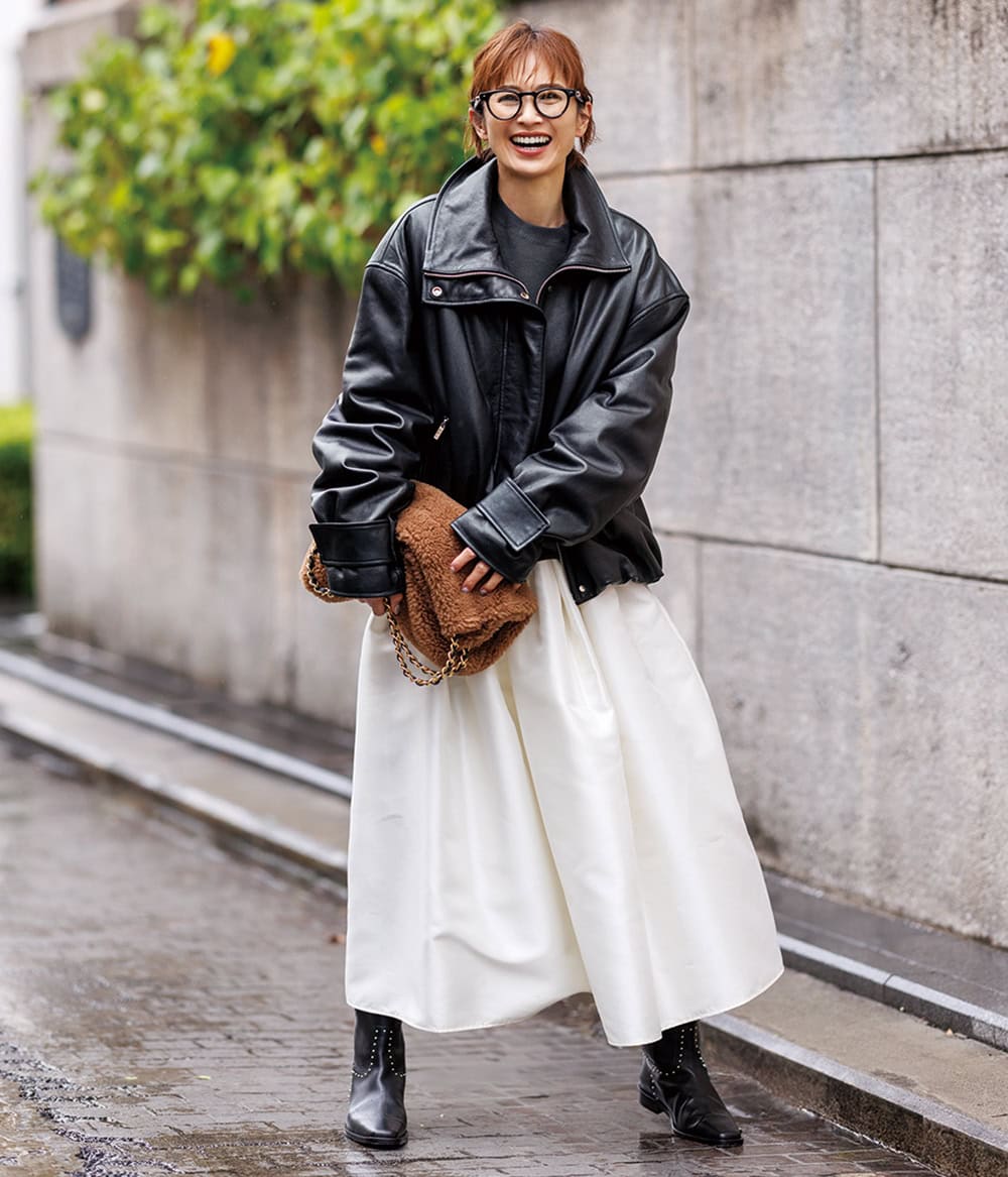 レザーアウターを今っぽく着こなすならボリュームのあるシルエットが正解! レザーのハードさが可愛げのある面持ちに!