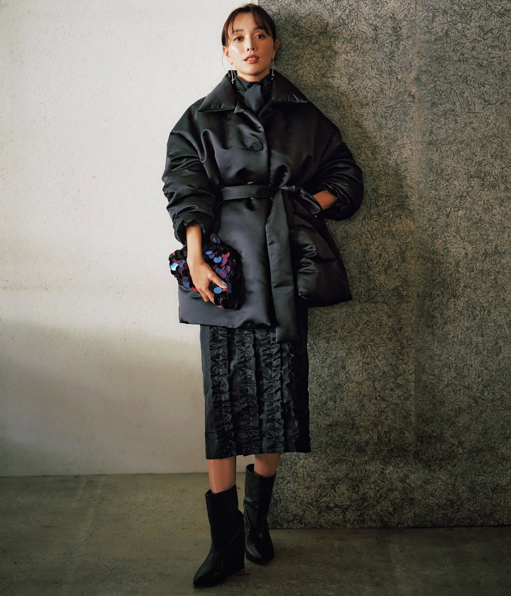 3位 ダウンなのにオシャレ!シルエットで魅せる【甘×マニッシュな黒コーデ】で夫婦ディナーへ