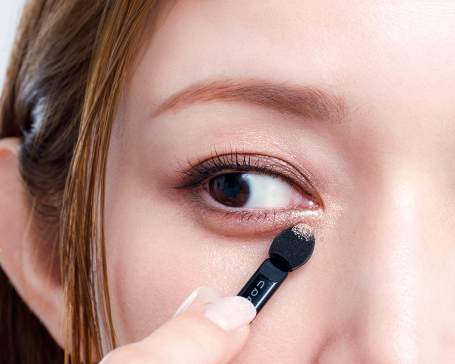 シグニチャー カラー アイズでまぶたにグラデを作った後、モノ ルック アイズL-01の煌めきラメを目頭にプラス。白目がよりクリアに見えます。